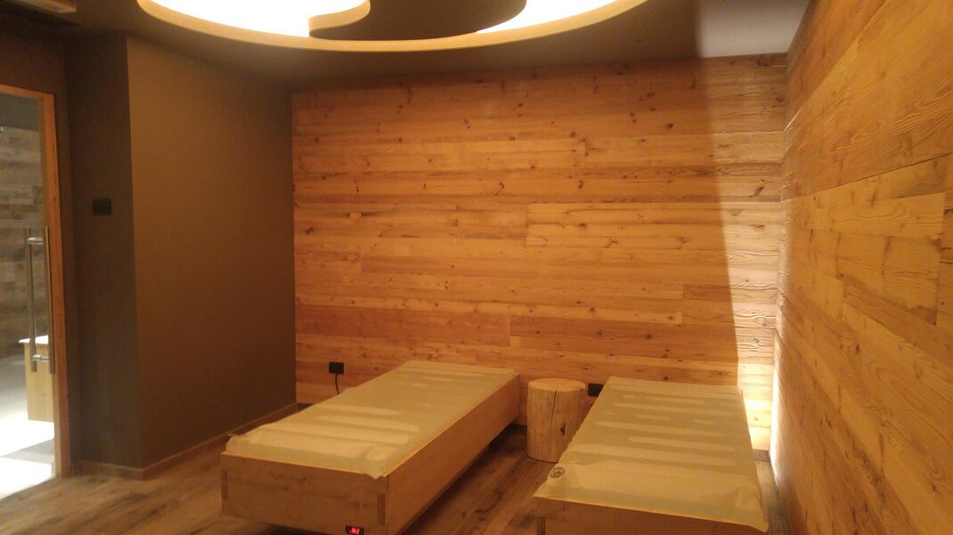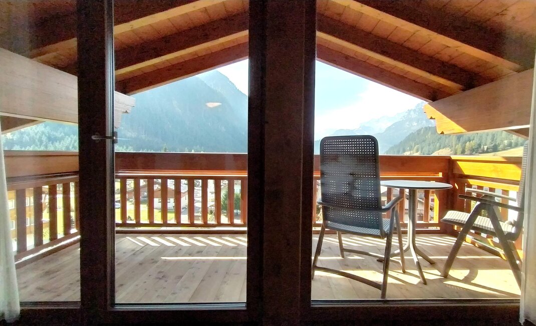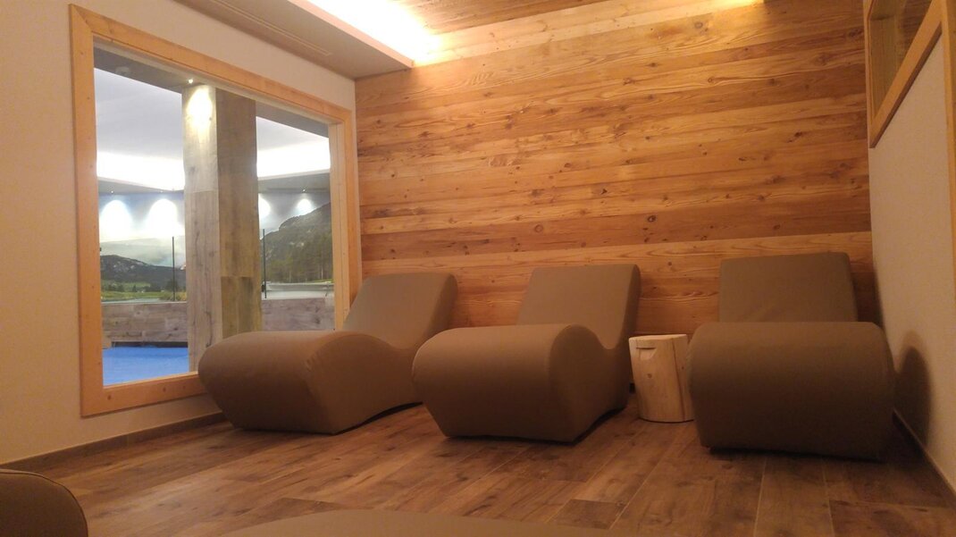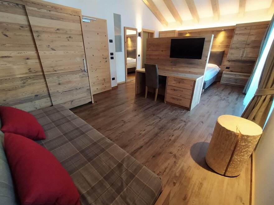 На 2/4 человека, площадь 25/30 кв. м с большим панорамным балконом. Обставлена экологически чистым деревом: лиственницей, дугласовой елью или старой еловой древесиной.