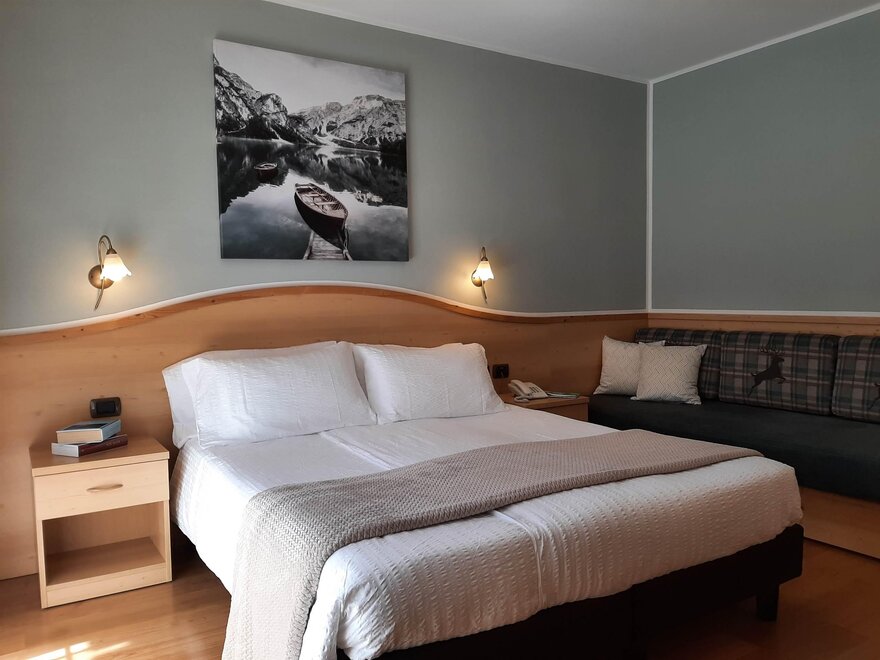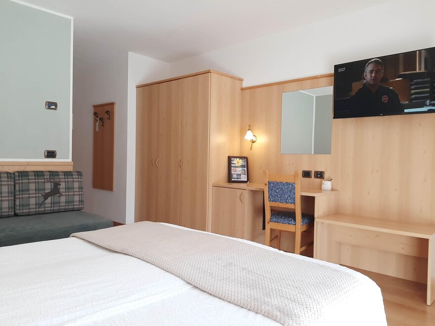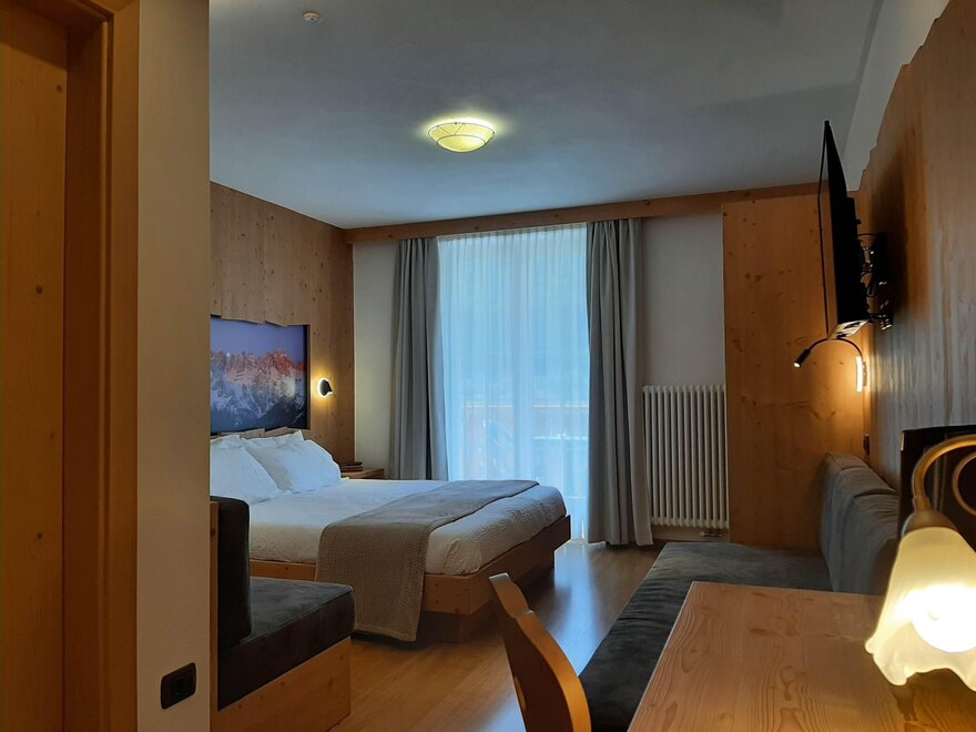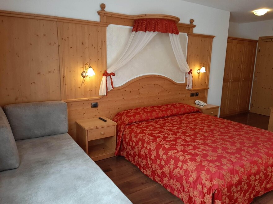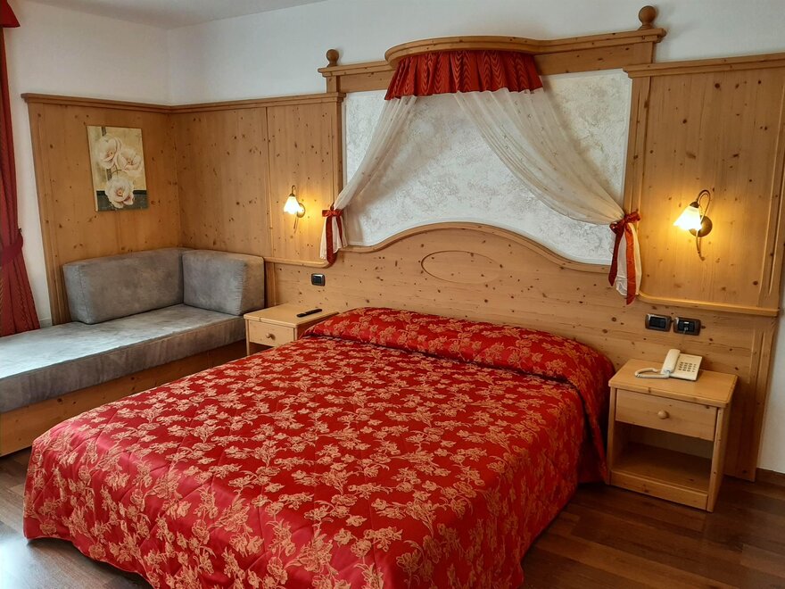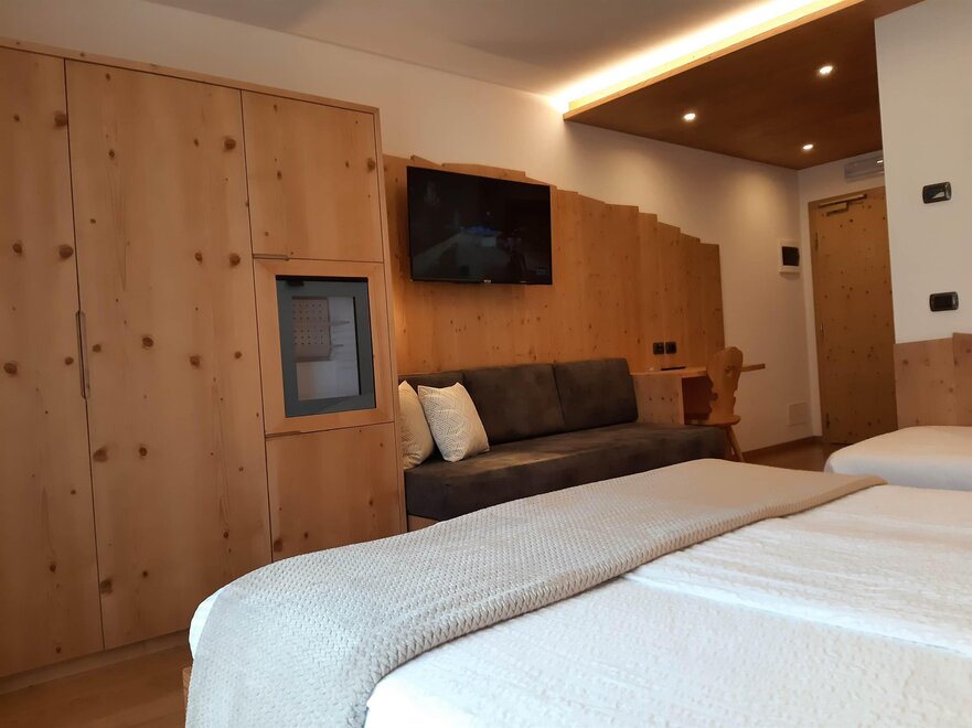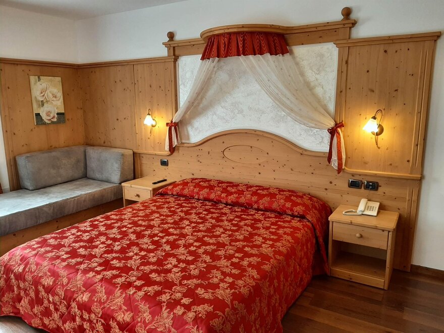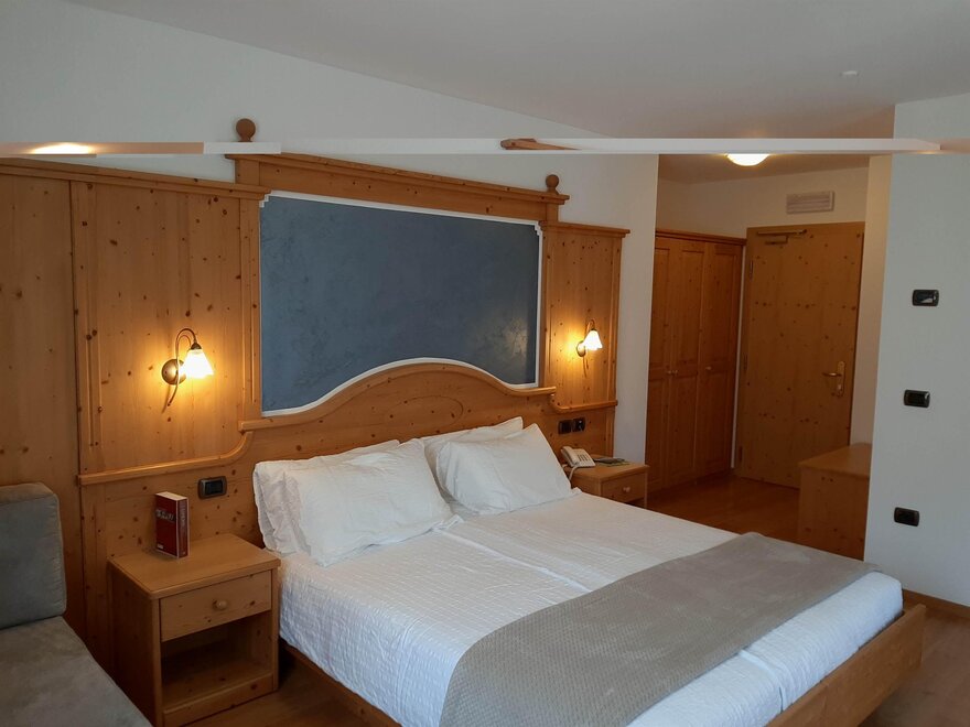 Room furnished in Alpine style, with quality materials and accessories, ideal for couples. Furnished in solid fir wood, it has a double bed, comfortable sofa bed, smart TV, mini-bar, safe, telephone, windowed bathroom with shower cubicle, hairdryer and complimentary toiletries, two balconies, one of which has a small table and two chairs, drying rack, Wi-Fi, parking space.