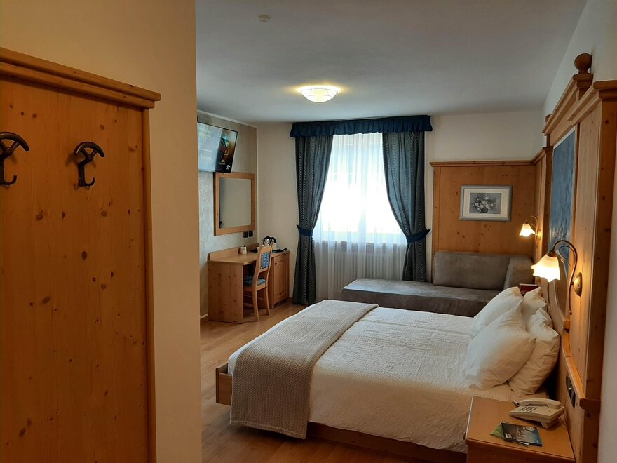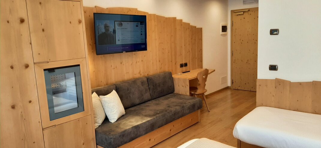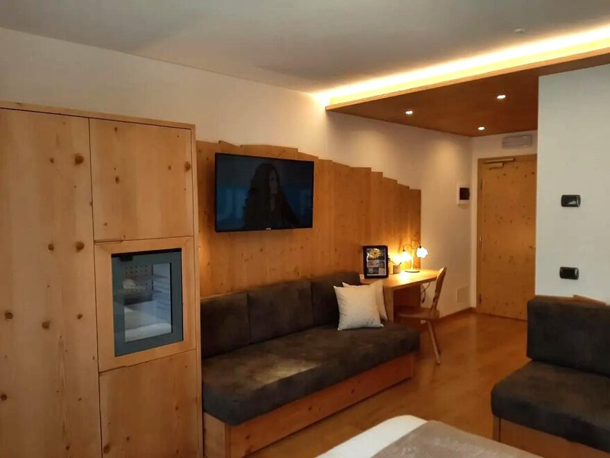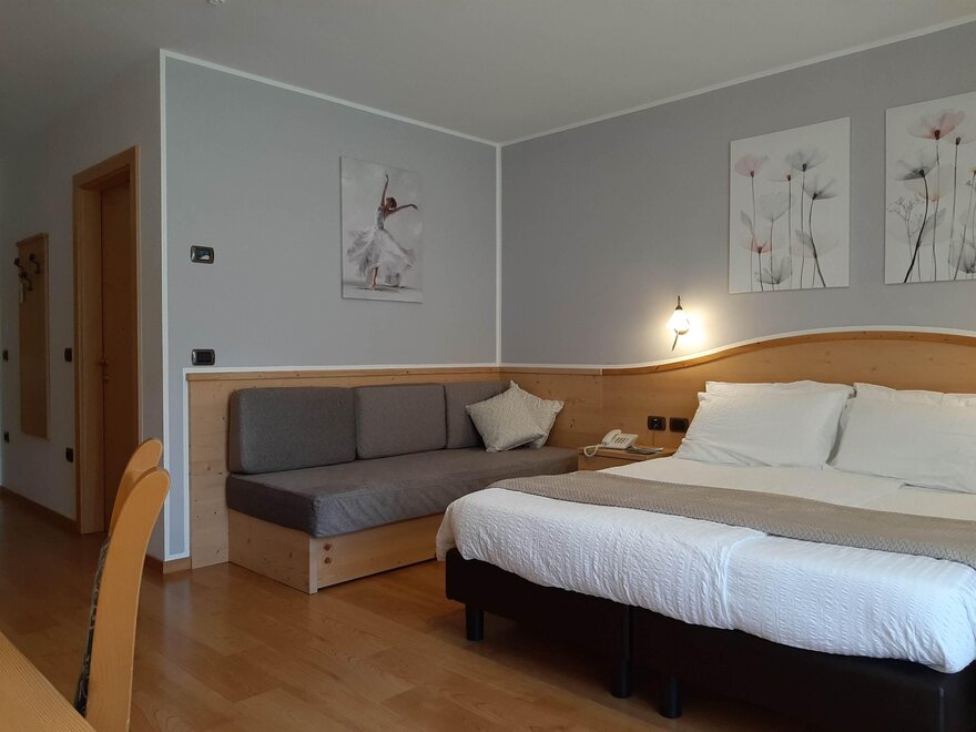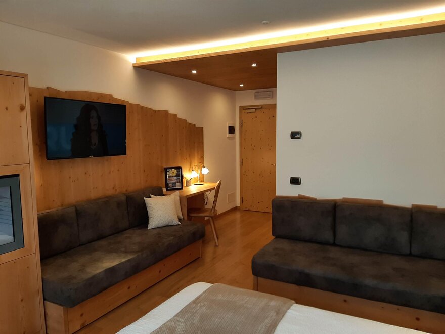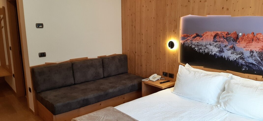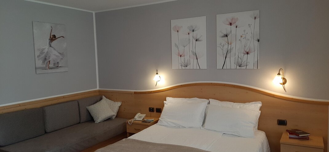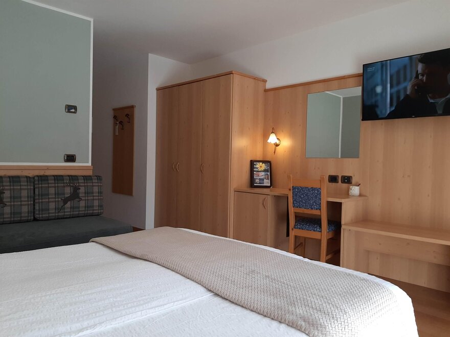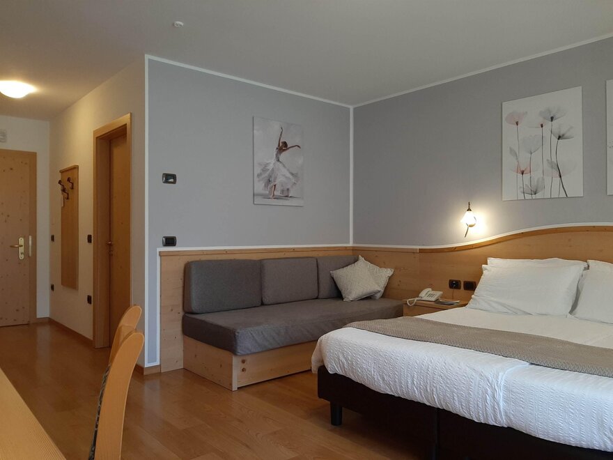 Room furnished in Alpine style, with quality materials and accessories, ideal for couples. Furnished in solid fir wood, it has a double bed, comfortable sofa bed, smart TV, mini-bar, safe, telephone, windowed bathroom with shower cubicle, hairdryer and complimentary toiletries, two balconies, one of which has a small table and two chairs, drying rack, Wi-Fi, parking space.