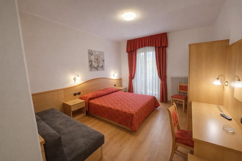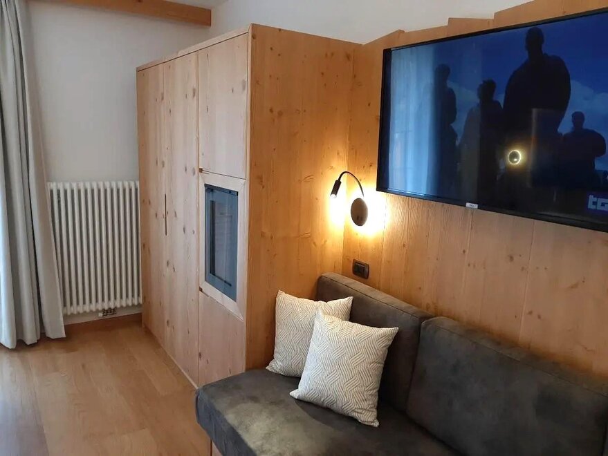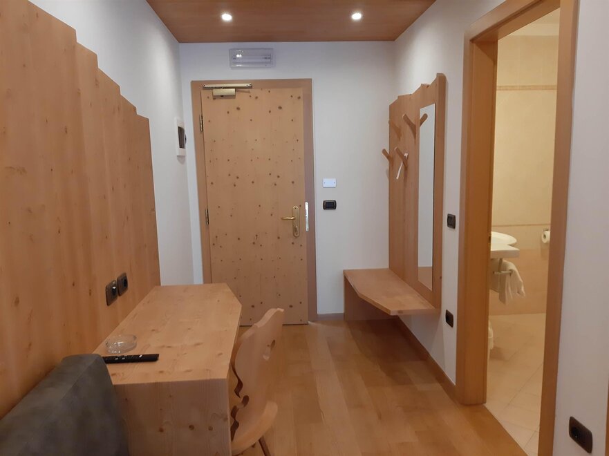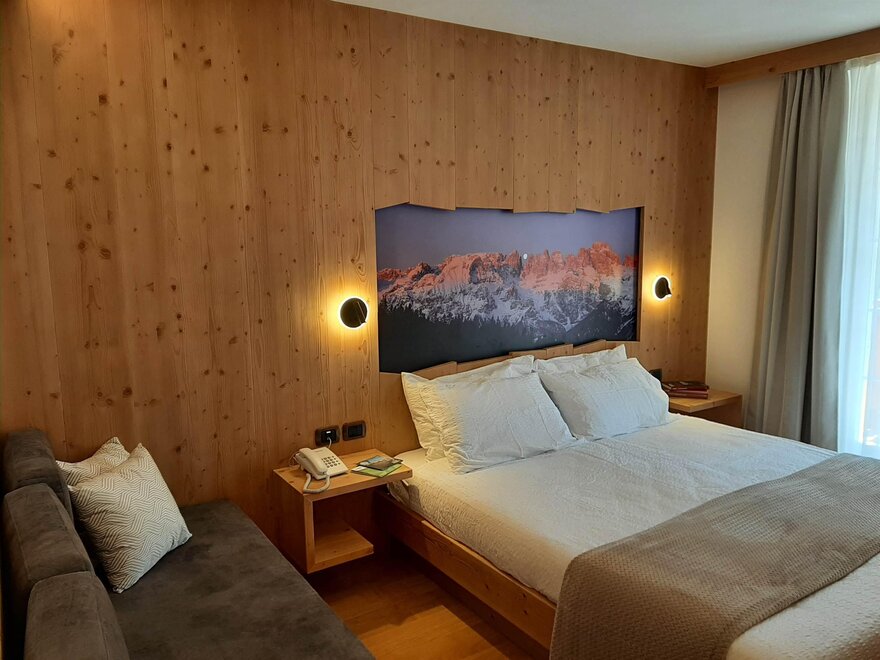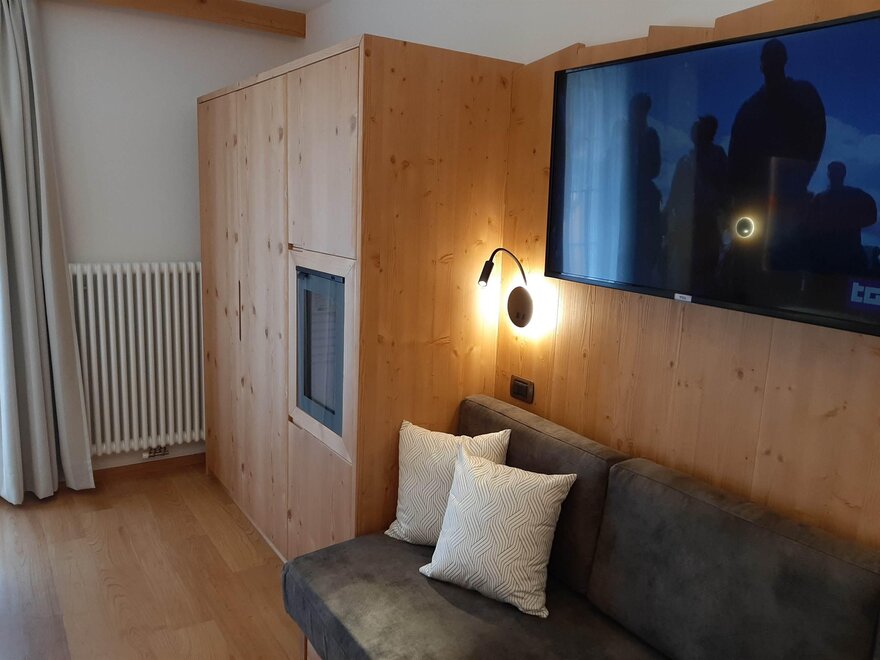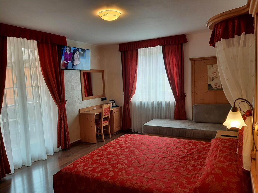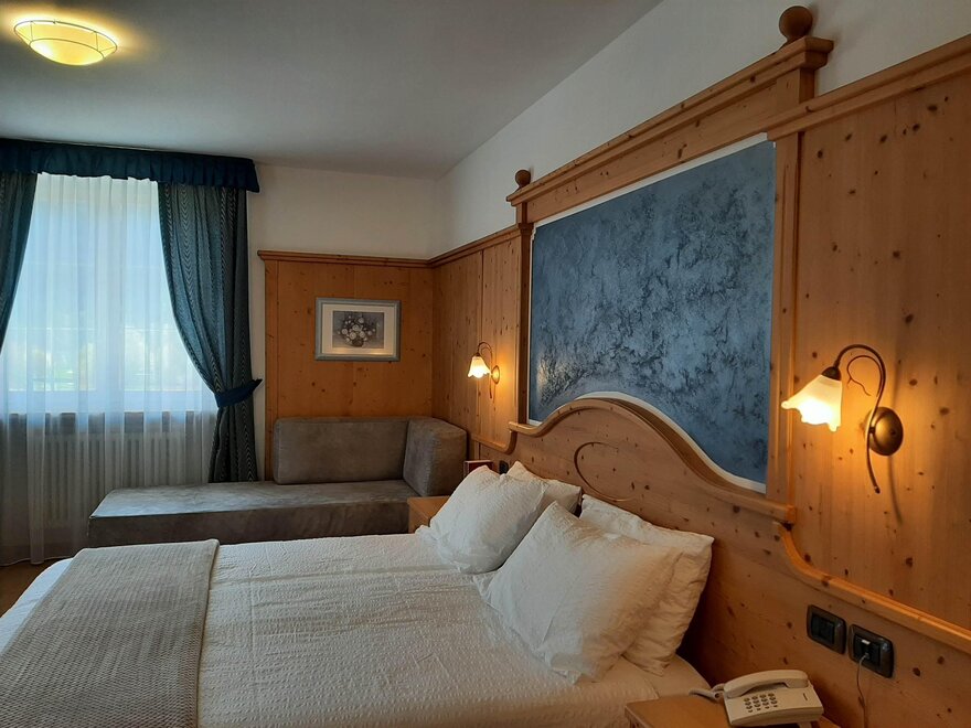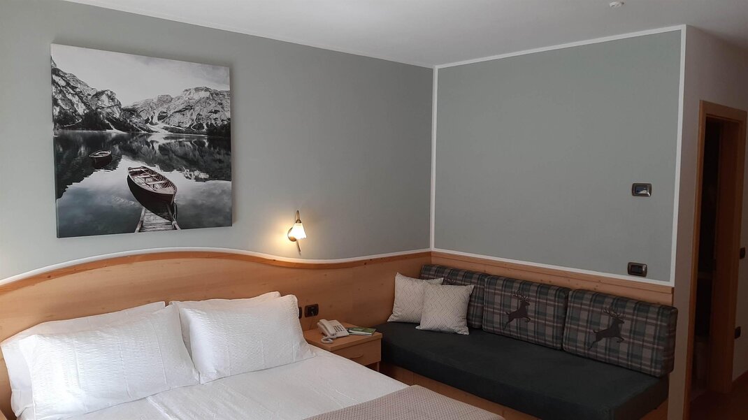 Room furnished in Alpine style, with quality materials and accessories, ideal for couples. Furnished in solid fir wood, it has a double bed, comfortable sofa bed, smart TV, mini-bar, safe, telephone, windowed bathroom with shower cubicle, hairdryer and complimentary toiletries, two balconies, one of which has a small table and two chairs, drying rack, Wi-Fi, parking space.