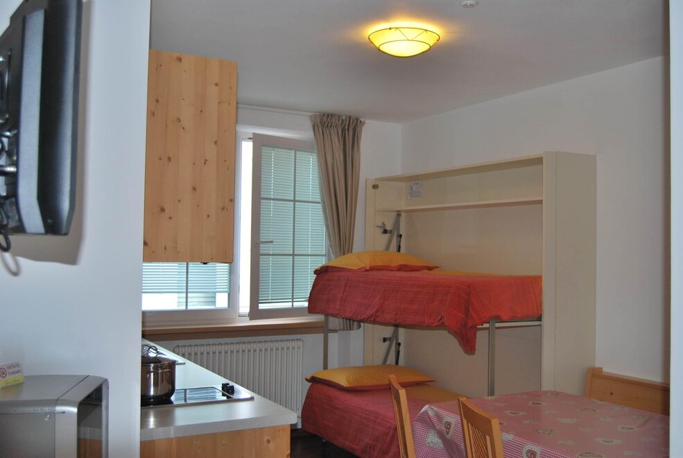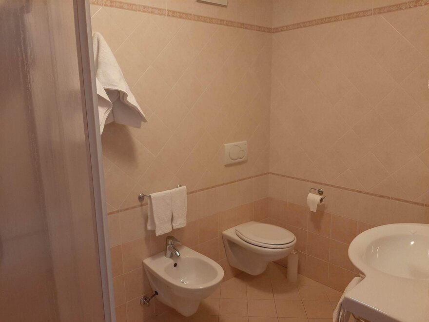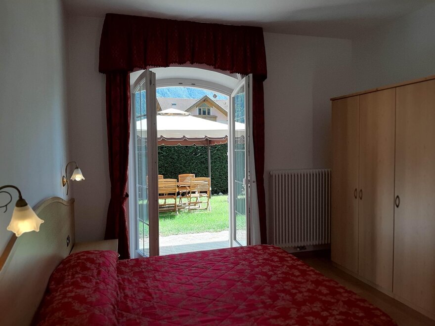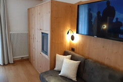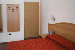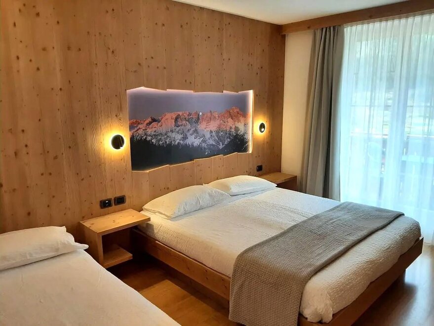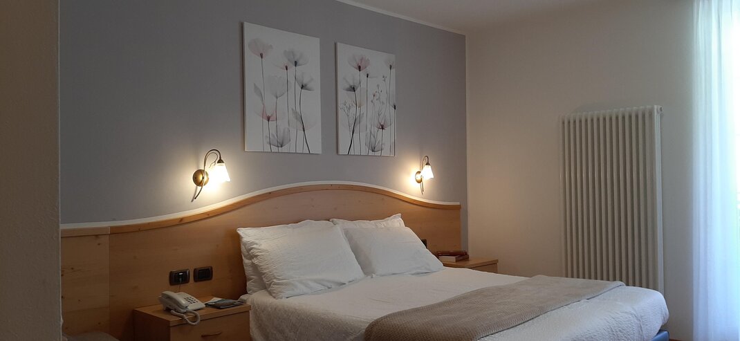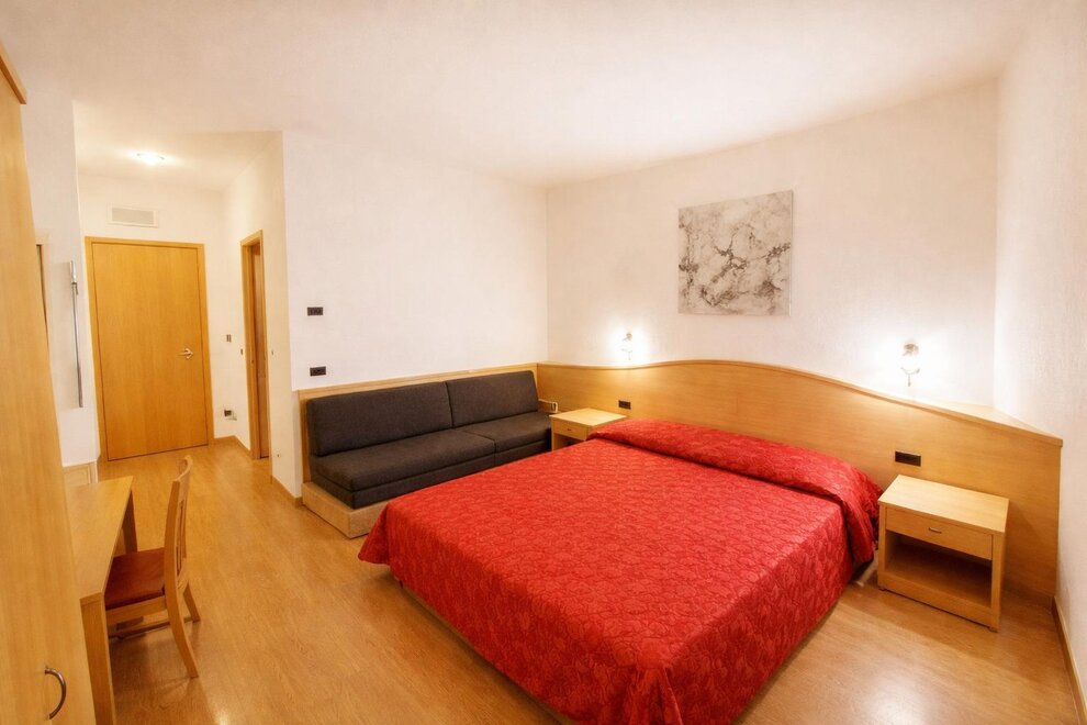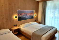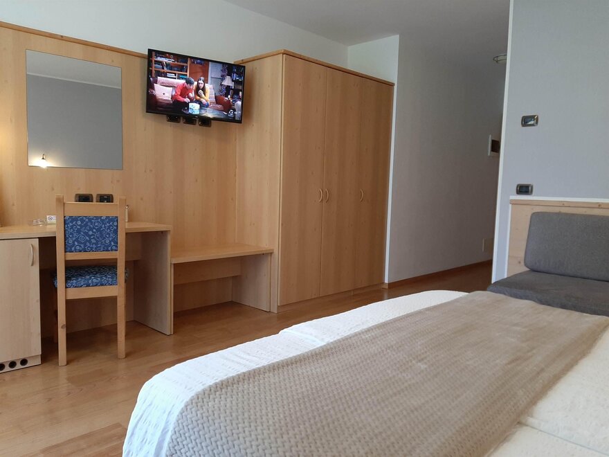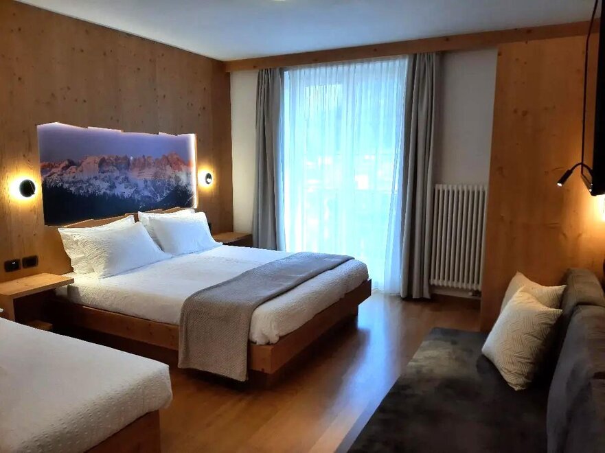 Room furnished in Alpine style, with quality materials and accessories, ideal for couples. Furnished in solid fir wood, it has a double bed, comfortable sofa bed, smart TV, mini-bar, safe, telephone, windowed bathroom with shower cubicle, hairdryer and complimentary toiletries, two balconies, one of which has a small table and two chairs, drying rack, Wi-Fi, parking space.