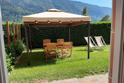 Просторная комната на первом этаже с оборудованным садом, идеальная для семей и тех, кто любит проводить время на свежем воздухе. Сад оборудован беседкой с столом и стульями.