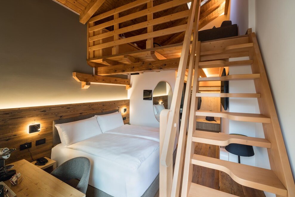 Кажкая деталь разработана для передачи гармонии и комфорта в пространстве, которое приглашает замедлиться и найти себя.Mini Green Suite расположены на первом и верхних этажах, идеально подходят для тех, кто ищет мгновение спокойствия среди гор Трентино, окутанный ароматом дерева и атмосферой теплого приема.