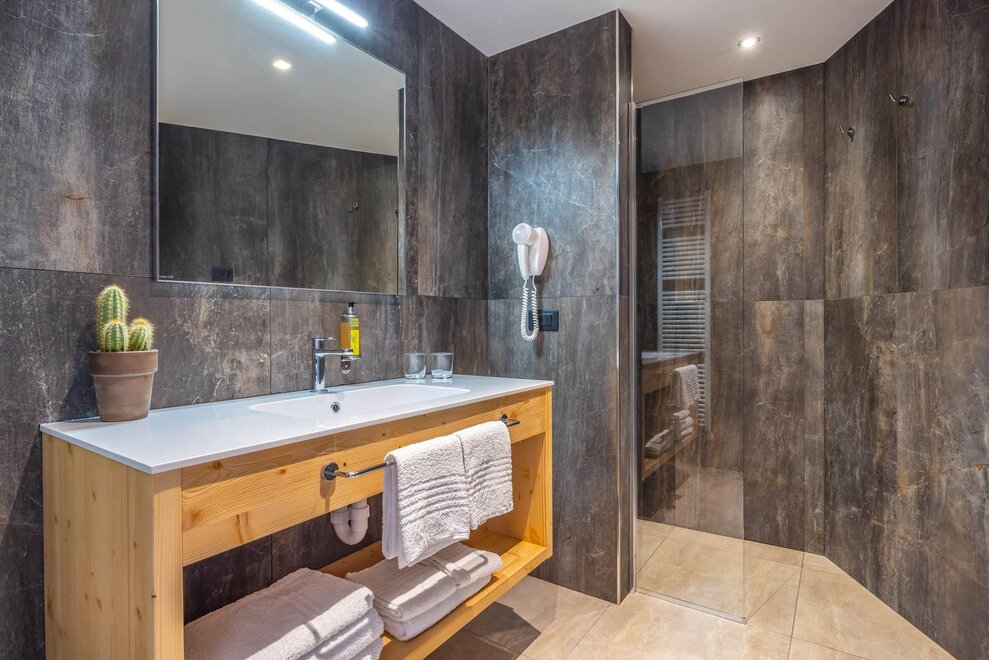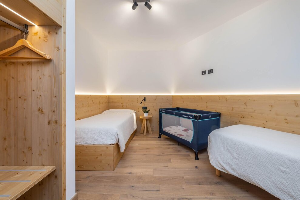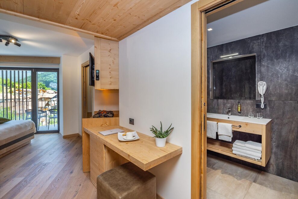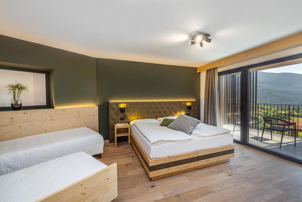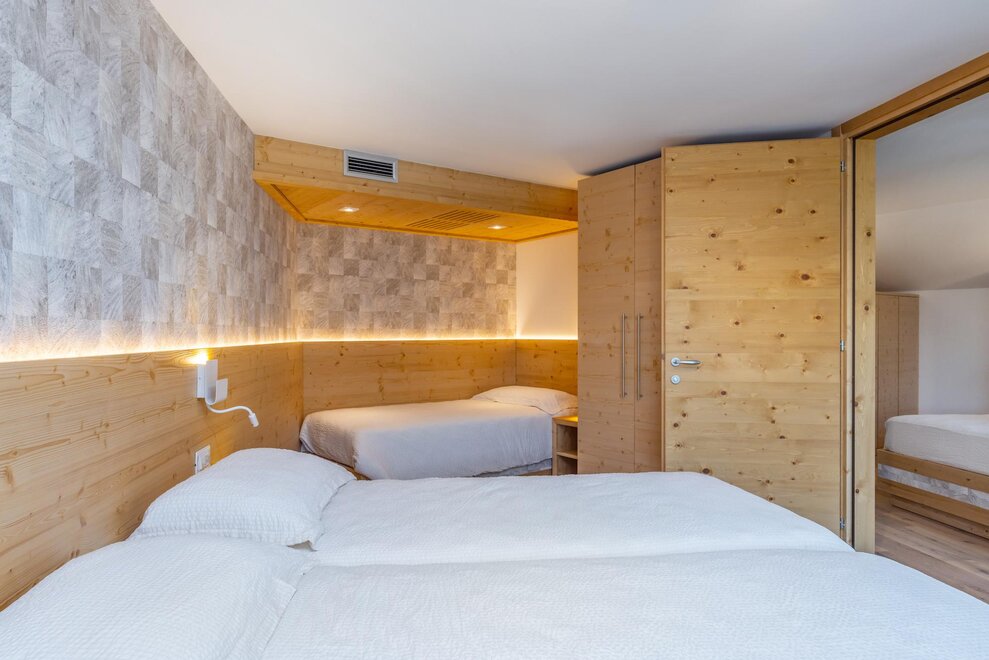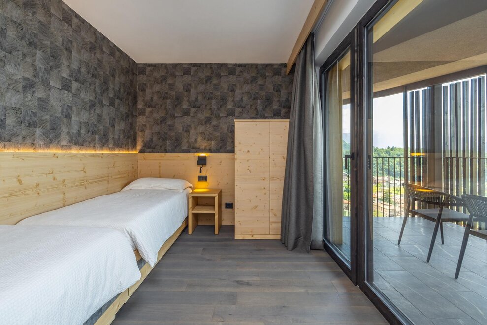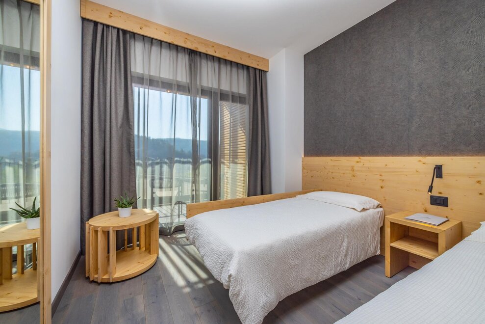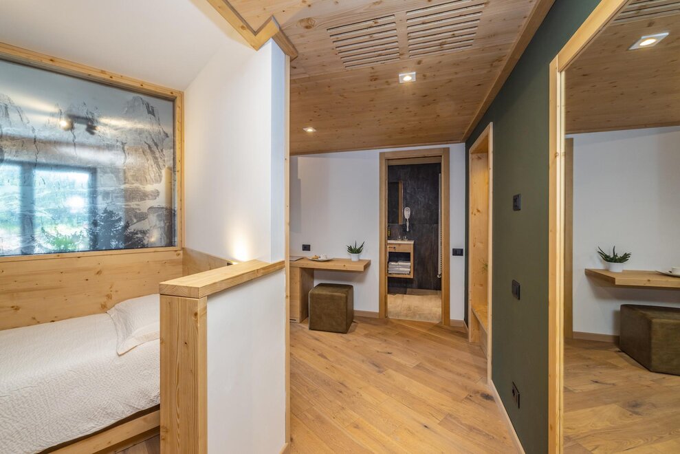 Совершенно новая соединяющая комната, оформленная из натуральных материалов, с полом из дуба и оборудованная двойным панорамным балконом.