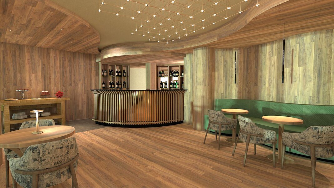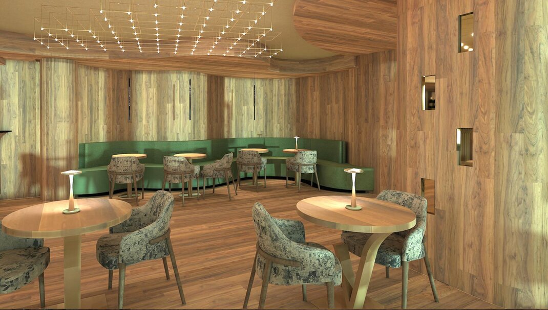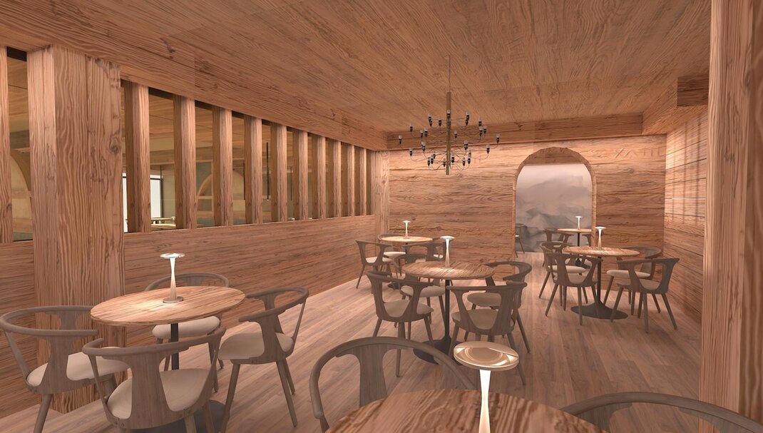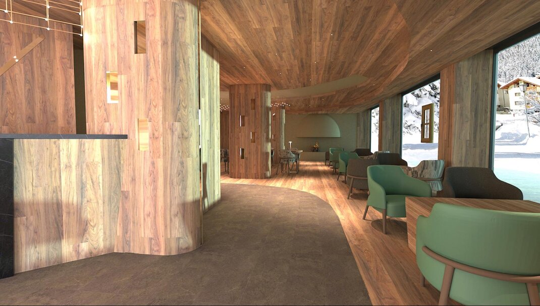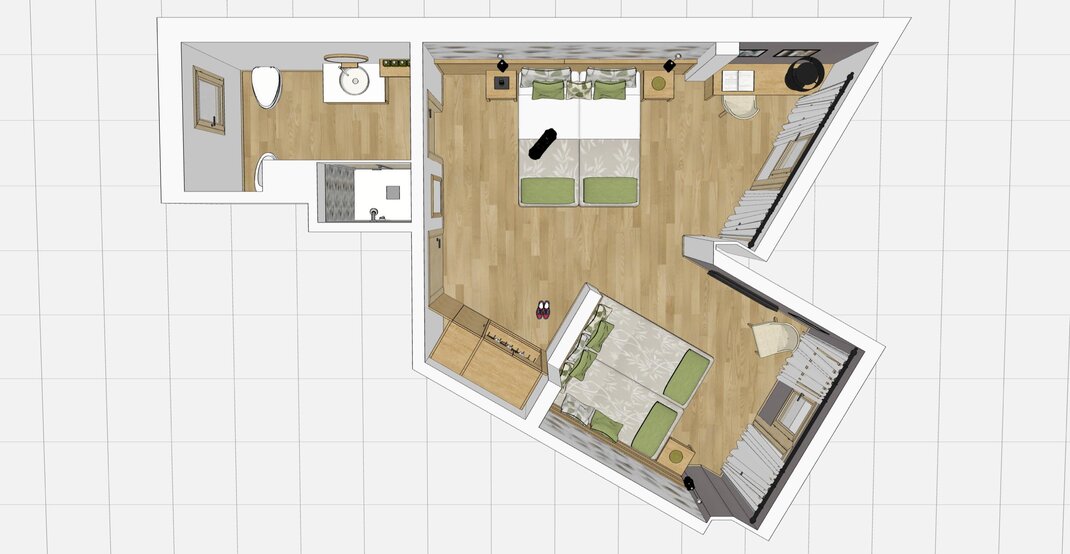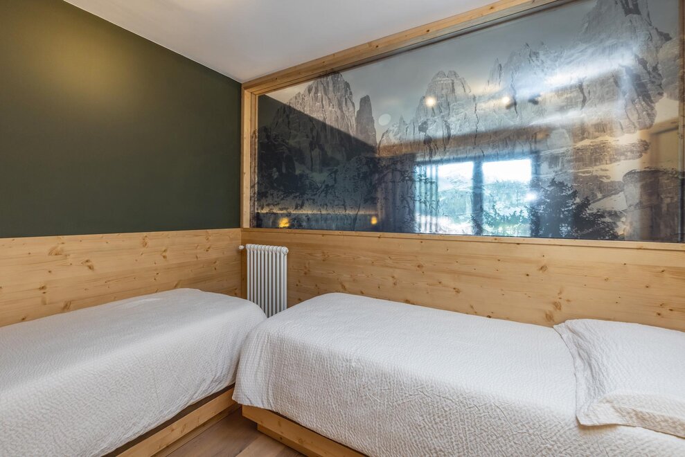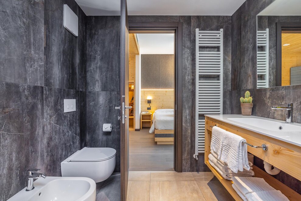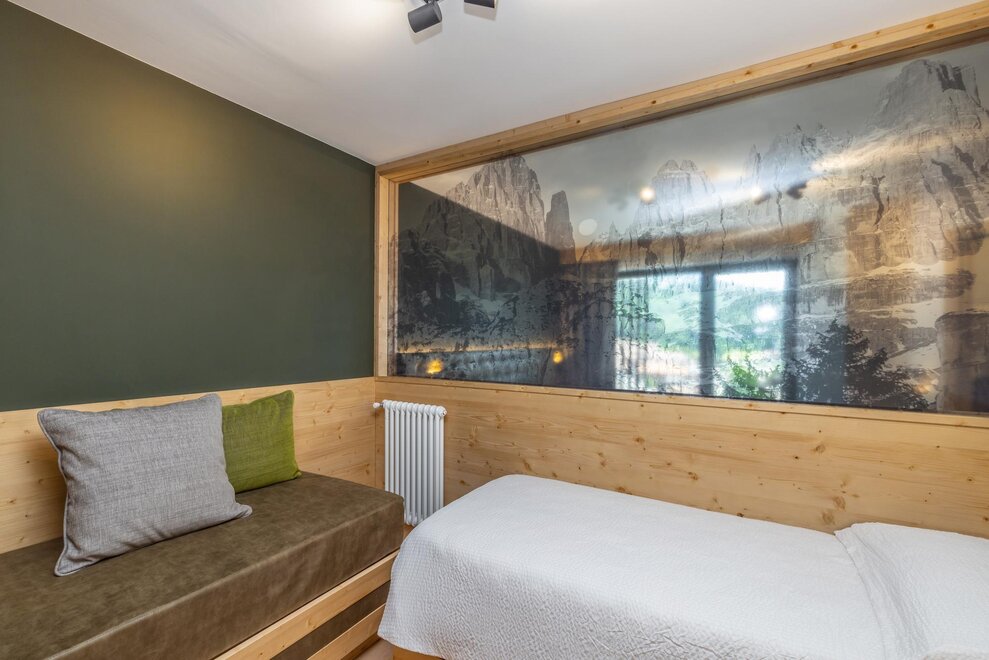 Совершенно новая соединяющая комната, оформленная из натуральных материалов, с полом из дуба и оборудованная двойным панорамным балконом.
