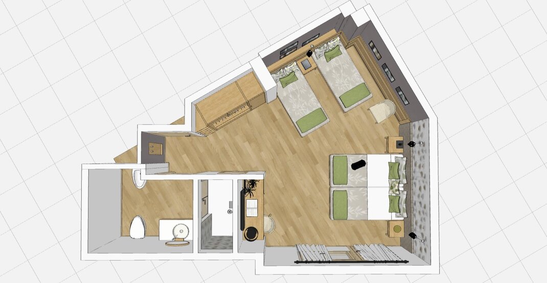 Совершенно новая комната, обставленная натуральными материалами и с паркетным полом из дуба.