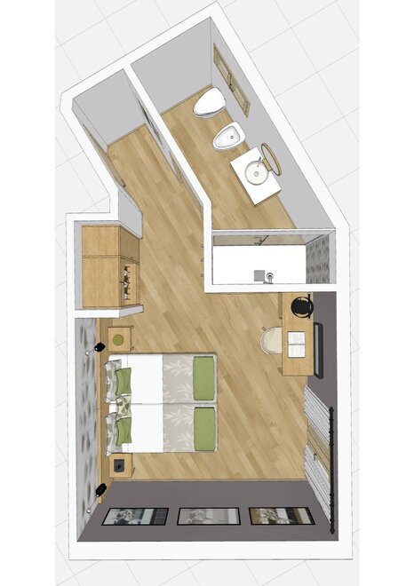 Совершенно новая комната с коммуникацией, оформленная из натуральных материалов, с дубовым паркетом и двухбалконным панорамным видом.