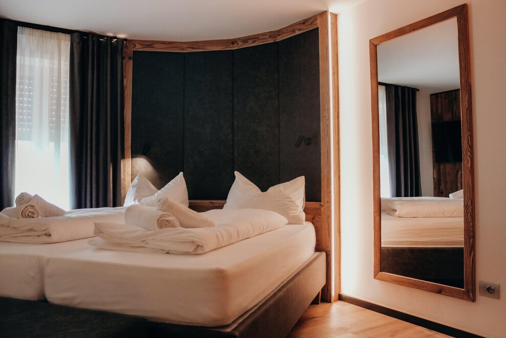 Широкие и комфортабельные, спальни оформлены с заботой в классическом альпийском стиле. Они сдержанны и уютны, а также оборудованы такими удобствами, как фен в ванной, телефон с прямым доступом наружу, сейф, телевизор с SAT-соединением, возможность подключения к интернету, почти все оснащены балконом.