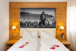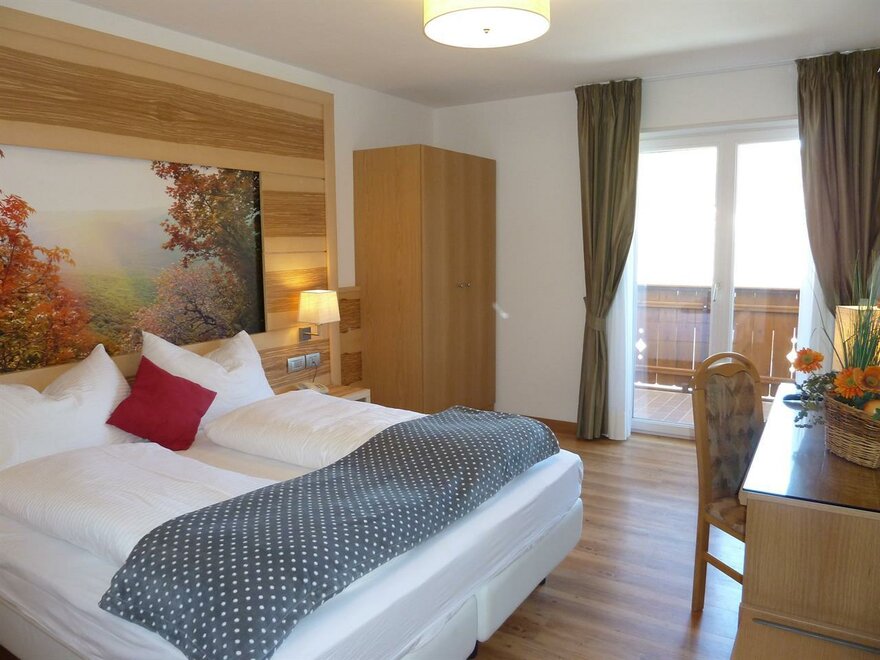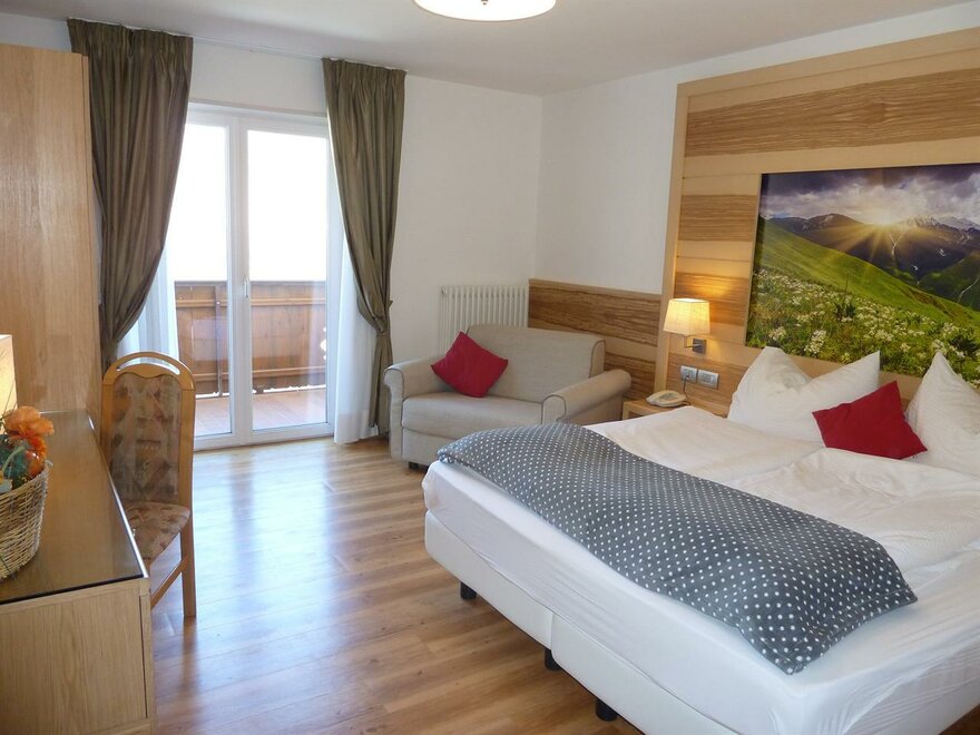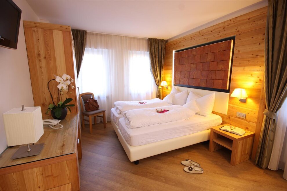 Широкие и уютные спальни оформлены с заботой в классическом альпийском стиле. Они сдержанные и комфортные, а также оборудованы такими услугами и удобствами, как фен в ванной, телефон с прямым доступом на улицу, сейф, телевизор с SAT-подключением, возможность подключения к Интернету, почти все с балконом.