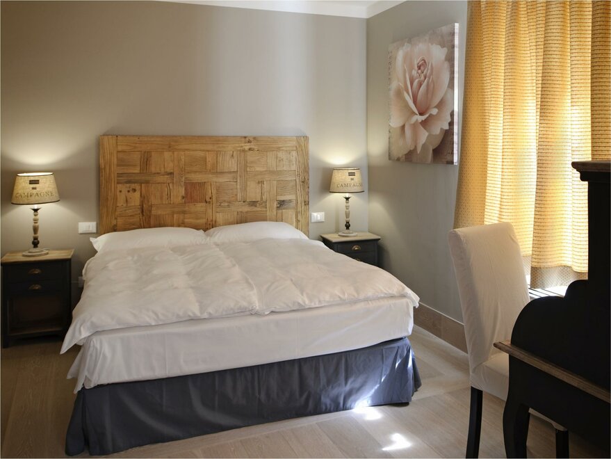 Spacious rooms, permeated by the light coming from the windows and from the little balcony out onto the court. A white headboard carved in wood like a lace embellishes and enriches the room. Superior rooms offer the warmth of classic rooms, combined with the comfort of more space, to make the stay more pleasant , not only for a couple, but also for two friends.