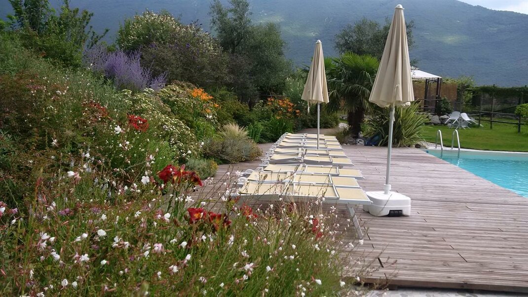 Acquastilla’ is the result of a deep-rooted idea of all-round biodiversity and eco-sustainability, and aims to publicise the products and specific aspects of our area. Maso Agritur Acquastilla Giovanni Poli is situated in the municipality of Arco in the agricultural area, just a short walk from Arciducale Park and the olive grove at Arco Castle. Maso Agritur Acquastilla, which is making the transition to organic farming, has an ambition to create a small oasis of biodiversity in an area which is rural but also urban. The accommodation includes 6 flats that can sleep a total 25 people, spread over 15,000 m2 of agricultural land. The complex is surrounded by an olive grove. Some experimental vines that do not need to be reated have been planted in the vineyard, and the swimming pool next to the vineyard is cleaned using UV radiation, a system which keeps the water clean reducing the use of chlorine to the minimum. There is a garden in front of each flat with particular plants and flower