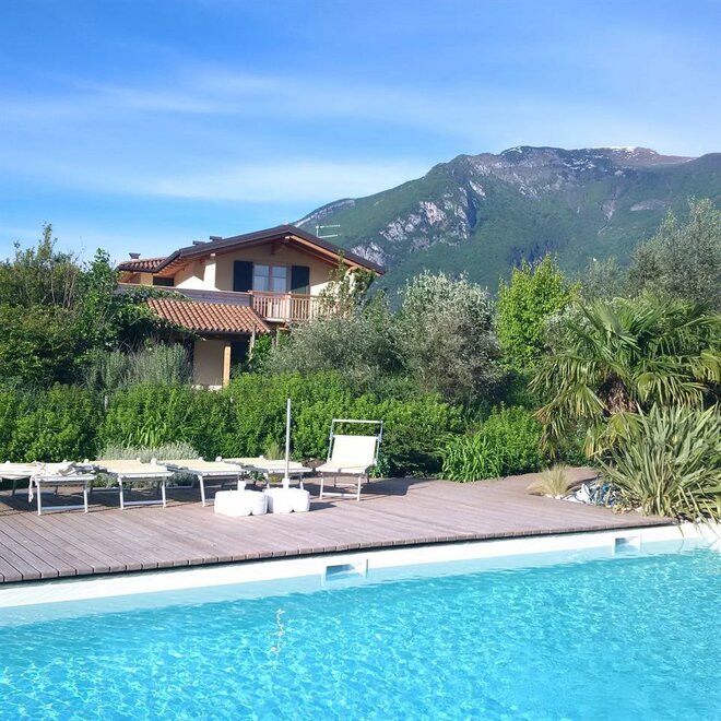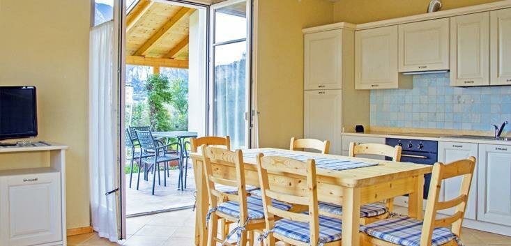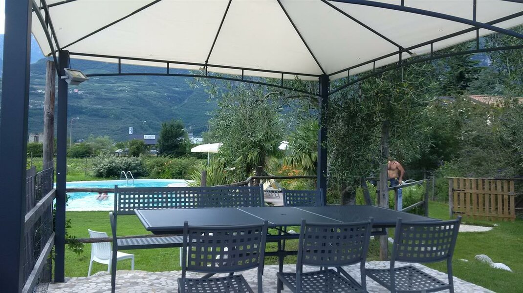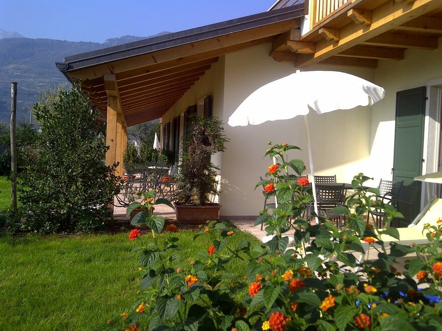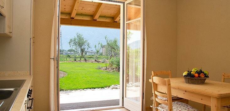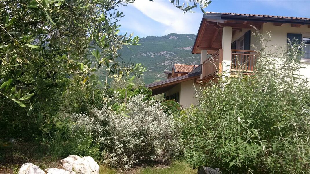 The ground floor apartments feature a veranda and private garden, while those on the upper floor have a balcony and a large panoramic terrace overlooking the castle of Arco, Mount Brione, and the entire valley. They are furnished with solid wood from fir and cirmolo, the walls are covered with clay, a natural thermal regulator of humidity. The cooling and heating system is wall-mounted (bio-building) and the apartments are equipped with a TV, dishwasher, oven, freezer, hairdryer, bed and bath linen, and Wi-Fi.