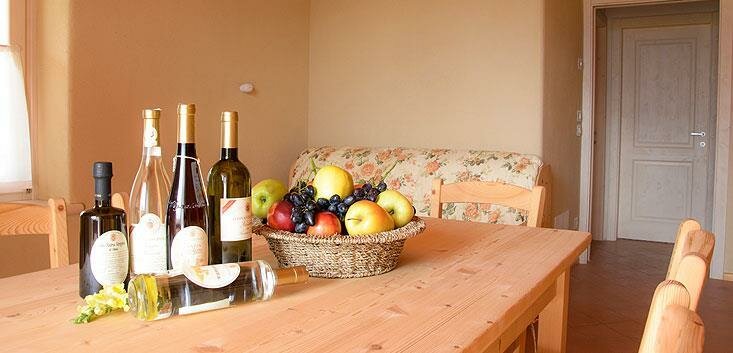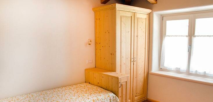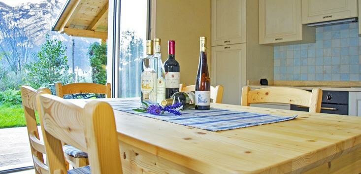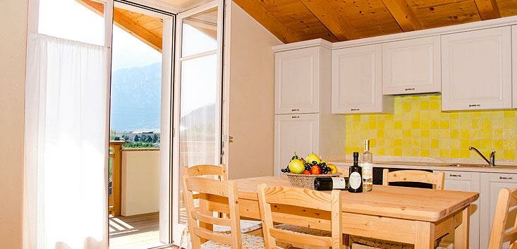The ground floor apartments have a veranda and private garden, while those on the upper floor feature a balcony and a large panoramic terrace overlooking the castle of Arco, Monte Brione, and the entire valley. They are furnished with solid spruce and Swiss pine wood, the walls are covered with clay, a natural thermal regulator of humidity, and the cooling and heating system is wall-mounted (bioconstruction). They are equipped with a TV, dishwasher, oven, freezer, hairdryer, bed and bath linens, and Wi-Fi. They are themed with references to local specialties: olive, Ora, medicinal herbs, Vino Santo, grappa, and grapes.