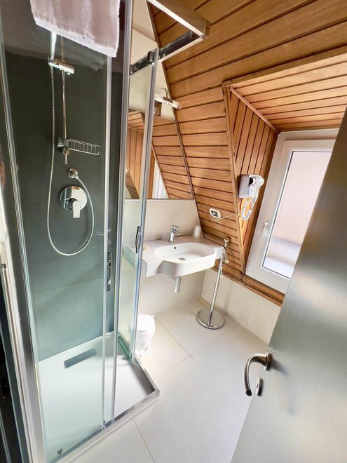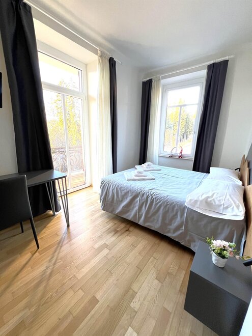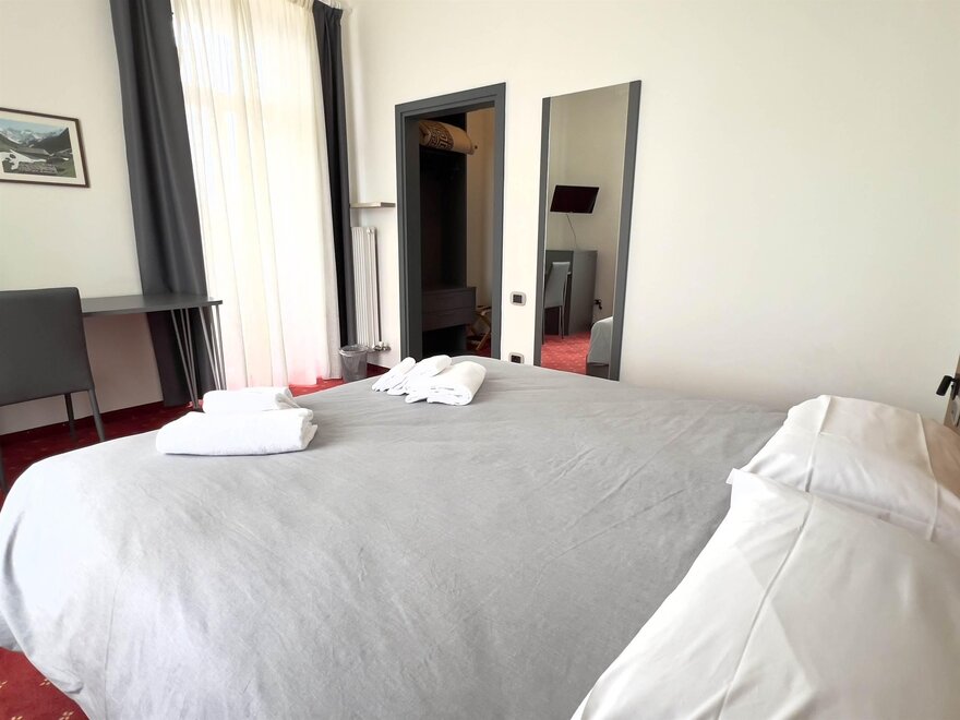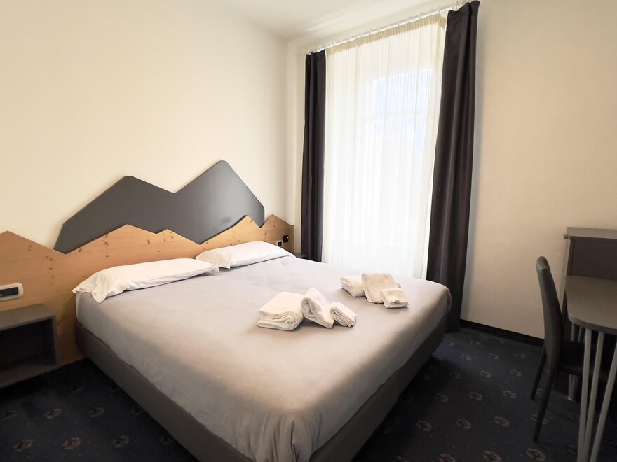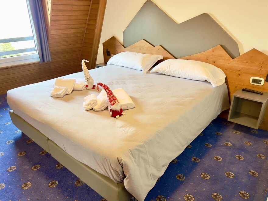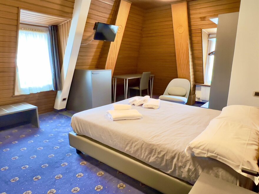 Мини-люксы: расположенные на четвертом этаже, предлагают эксклюзивный и интимный опыт, обладая очарованием мансарды с деревянными балками, создающими теплую и утонченную атмосферу. Из широких окон гости могут наслаждаться захватывающим видом на долину, делая каждый момент еще более особенным. Номера, просторные и уютные, оборудованы двуспальной кроватью, письменным столом и зоной отдыха с креслом, идеально подходящей для наслаждения моментами спокойствия. Каждое мини-люксовое помещение оснащено холодильником, сейфом и письменным столом, предлагая максимальный комфорт и функциональность. Идеальное укрытие для романтического вечера, пропитанного уединением и расслаблением.