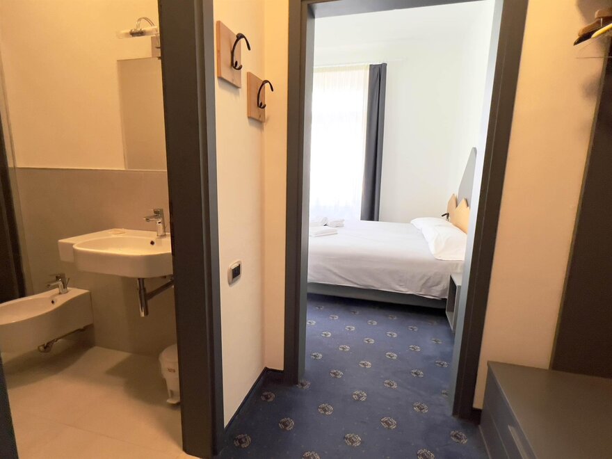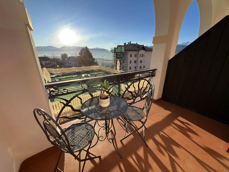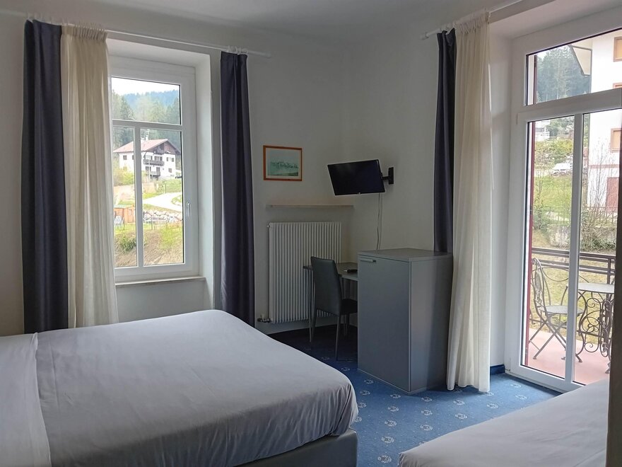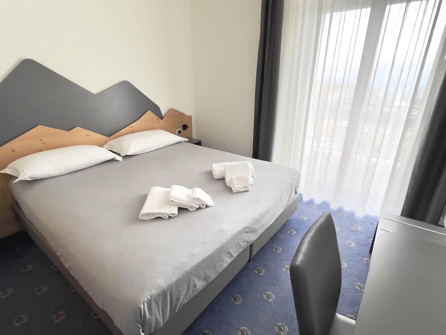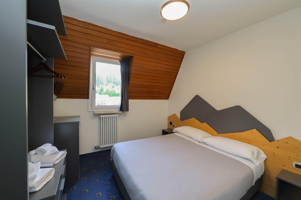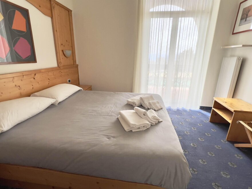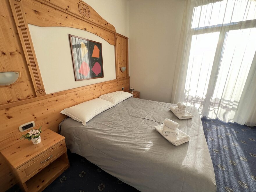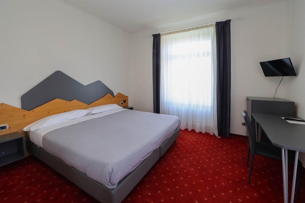 Двухместный номер Делюкс, уютная и светлая комната с просторным балконом, предлагающим захватывающий вид на Доломиты, величественные горы на горизонте. Внутреннее оформление номера выполнено в альпийском стиле, с теплым деревянным декором и ковровым покрытием. На балконе стоит небольшой столик с двумя стульями, где можно расслабиться, наслаждаясь свежим горным воздухом и потрясающим пейзажем, попивая хороший аперитив. Внутри находится удобная двуспальная кровать с белоснежным мягким бельем, идеально подходящая для восстановительного сна. Рядом расположено рабочее место для чтения или спокойной работы. Современный телевизор установлен на стене, а сейф доступен для хранения ценных вещей. Этот номер — идеальное укрытие для тех, кто ищет отдых и оздоровление с ноткой элегантности и захватывающим видом.