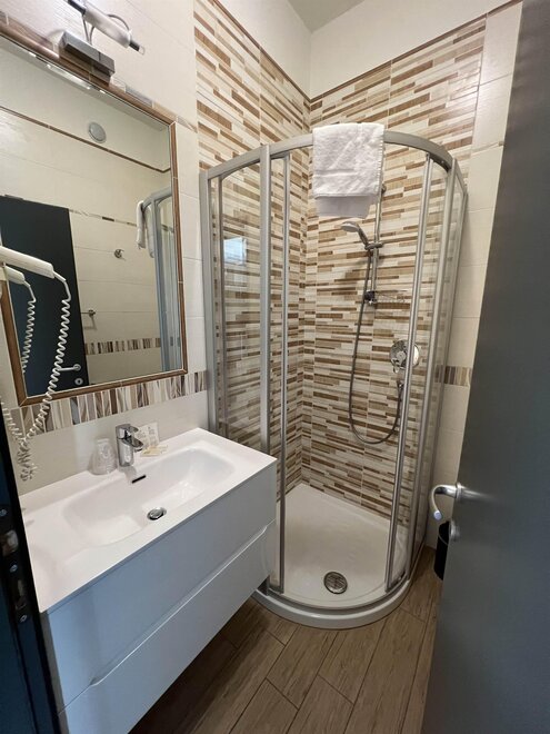 Трехместные номера (кол-во 6) 22 кв.м. предлагают комфортную и функциональную обстановку, идеально подходящую для размещения до 3 человек. Каждый номер оборудован двуспальной кроватью и односпальной кроватью, а также письменным столом, телевизором и холодильником для удовлетворения всех потребностей во время пребывания. Номера на втором этаже обладают собственным внешним балконом, оснащенным столом и стульями, где гости могут расслабиться на свежем воздухе. Все номера имеют собственную ванную комнату с окном, выходящим на улицу, и комплектом туалетных принадлежностей, включая полотенца и простыни, для обеспечения максимального комфорта и уюта.