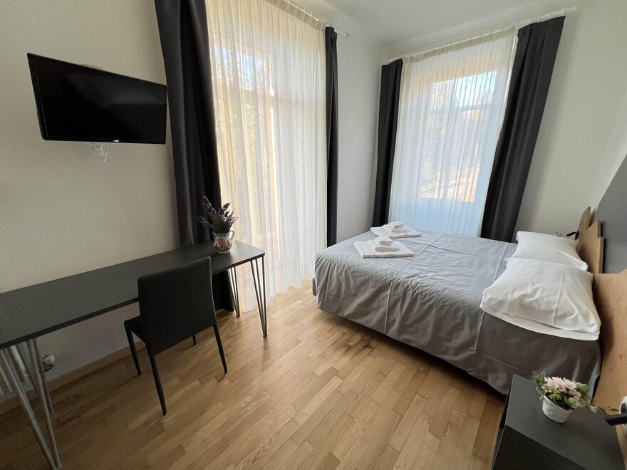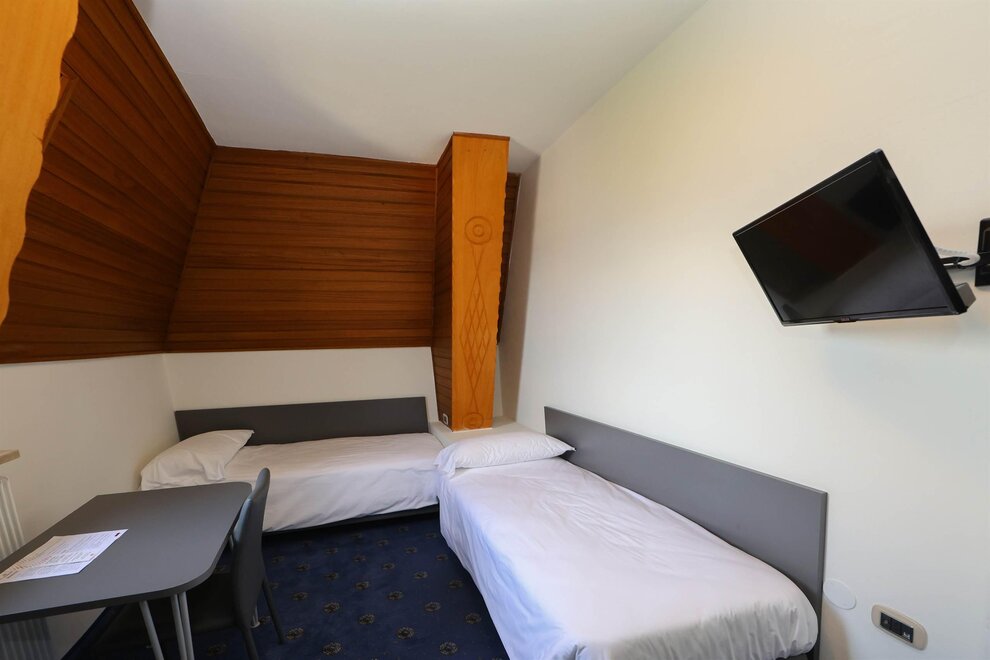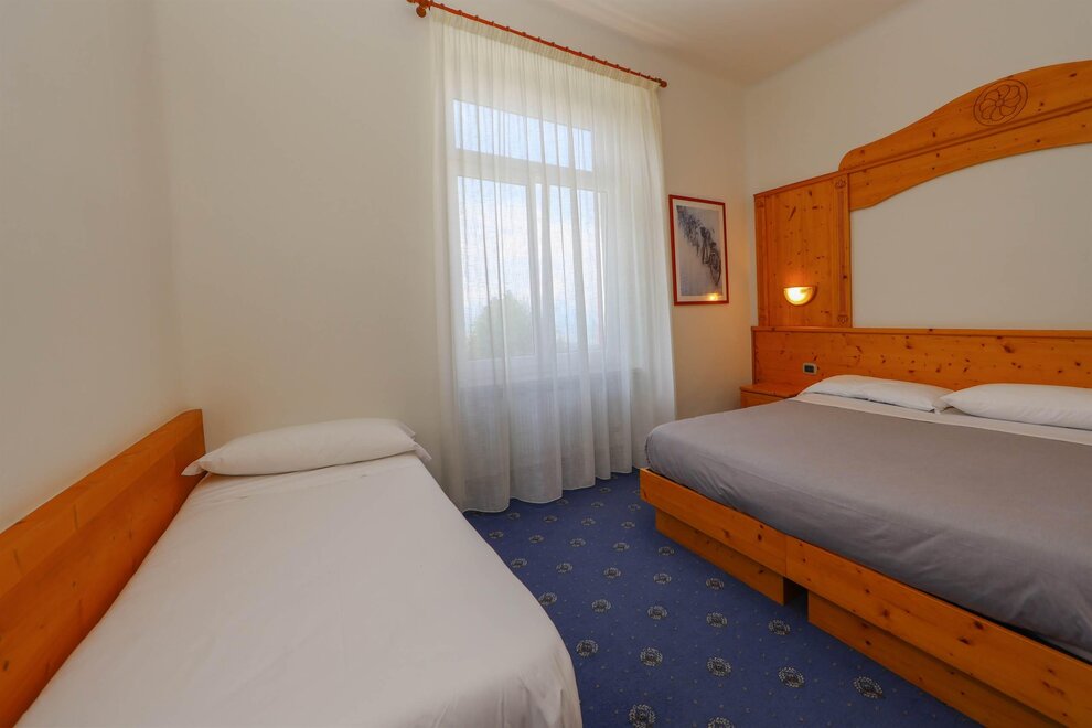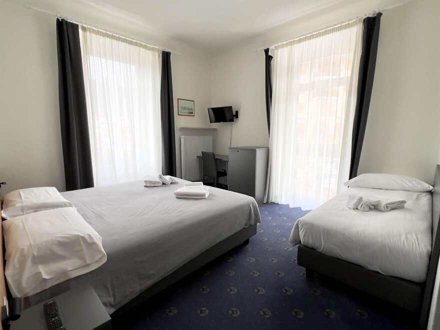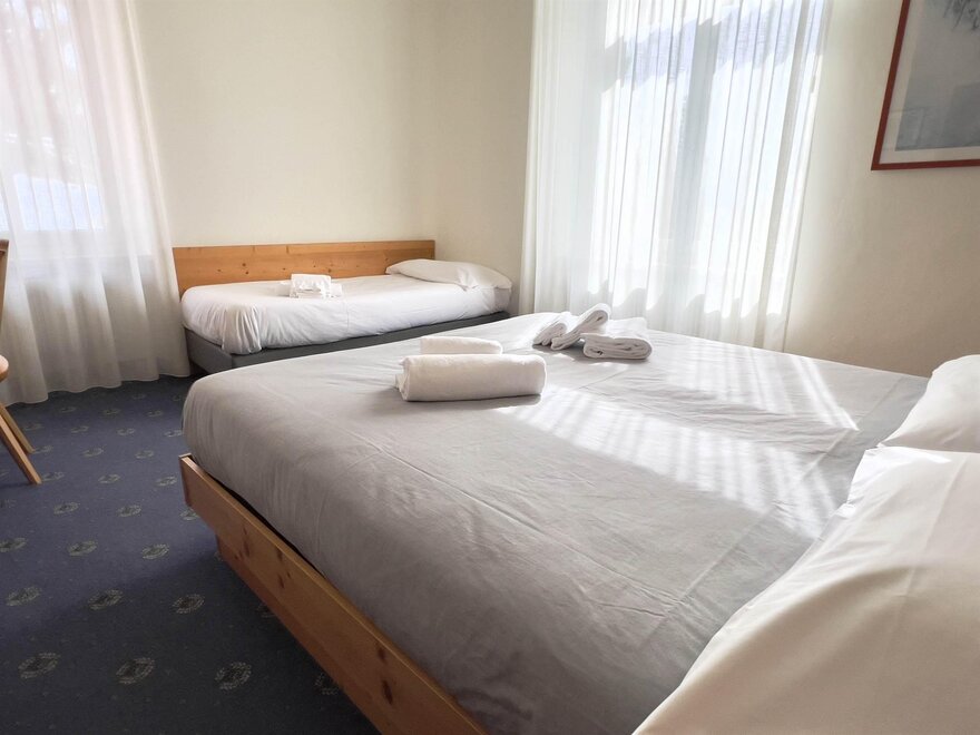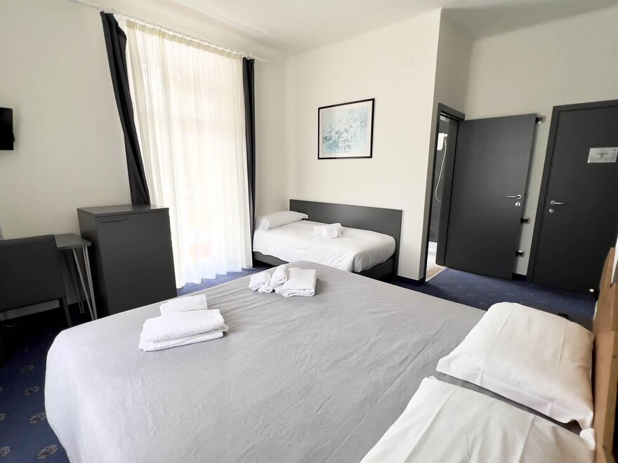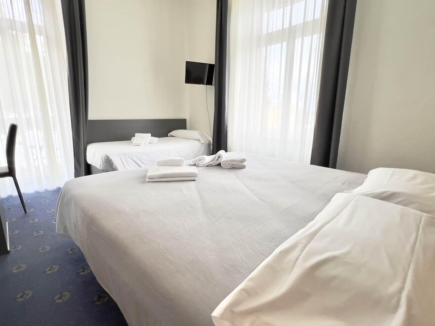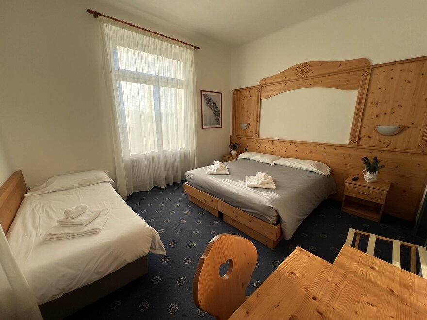 Трехместные номера (кол-во 3) 22 кв. м. идеальны для размещения до 3 человек. Каждый номер оснащен двуспальной кроватью и односпальной кроватью, а также письменным столом, телевизором и холодильником, чтобы удовлетворить все потребности во время пребывания.