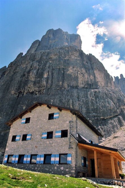 Это последний приют, построенный с нуля SAT у подножия Пика Мадонны. Он был открыт в сентябре 1980 года и назван в честь Уголка Вело, то есть одной из самых красивых классических альпинистских маршрутов Доломитов: это 440 метров скальной стены, которая впервые была пройдена в 1920 году и по-прежнему привлекает альпинистов (опытных) со всего мира. Неподалеку, через Пик Чимерло, в одном из самых удаленных уголков Пале, также есть оборудованный маршрут, посвященный Дино Бадзати, журналисту (и писателю) из Беллуно, который любил Пале ди Сан-Мартино больше, чем любую другую доломитовую группу.