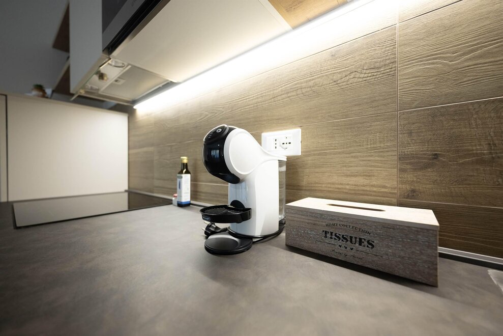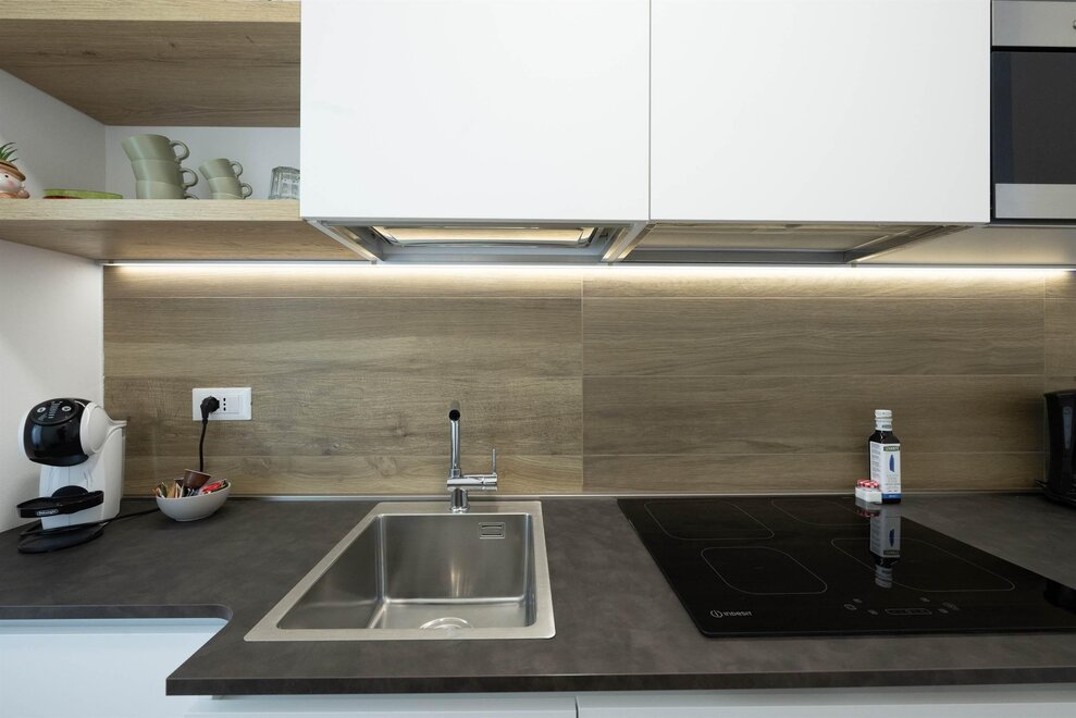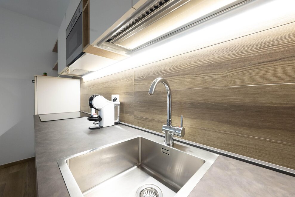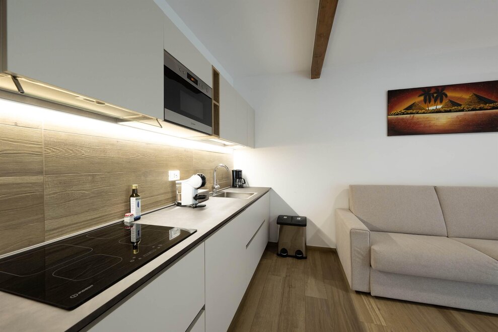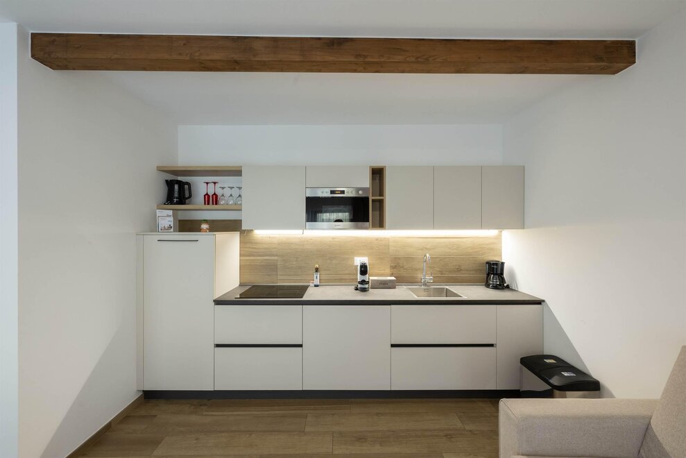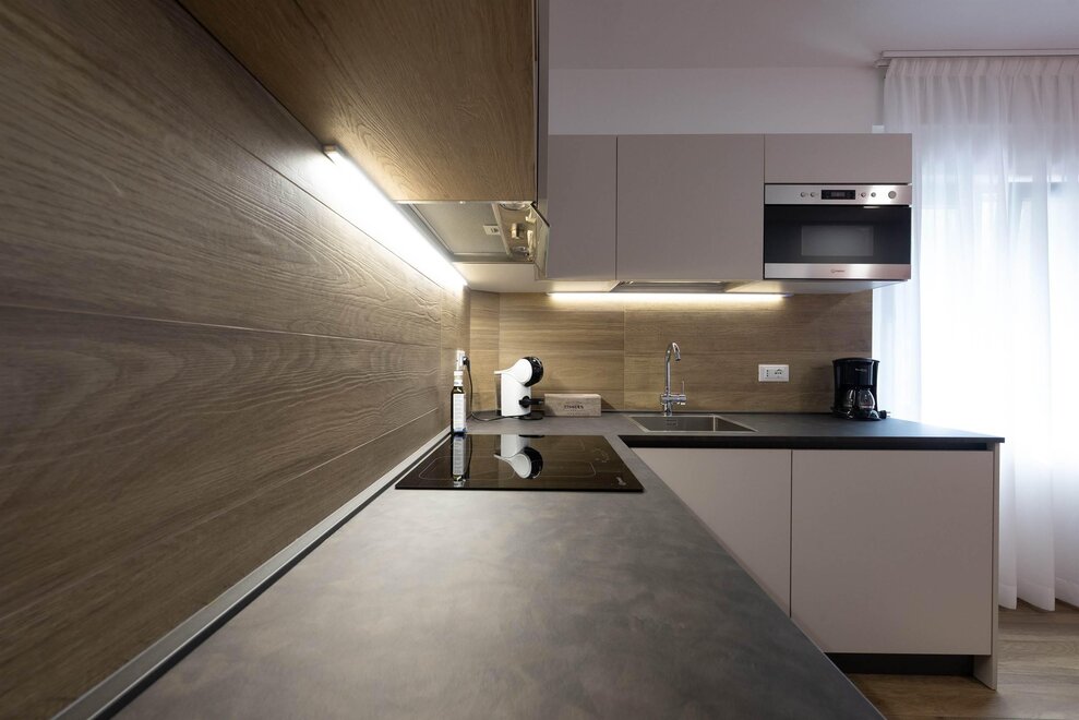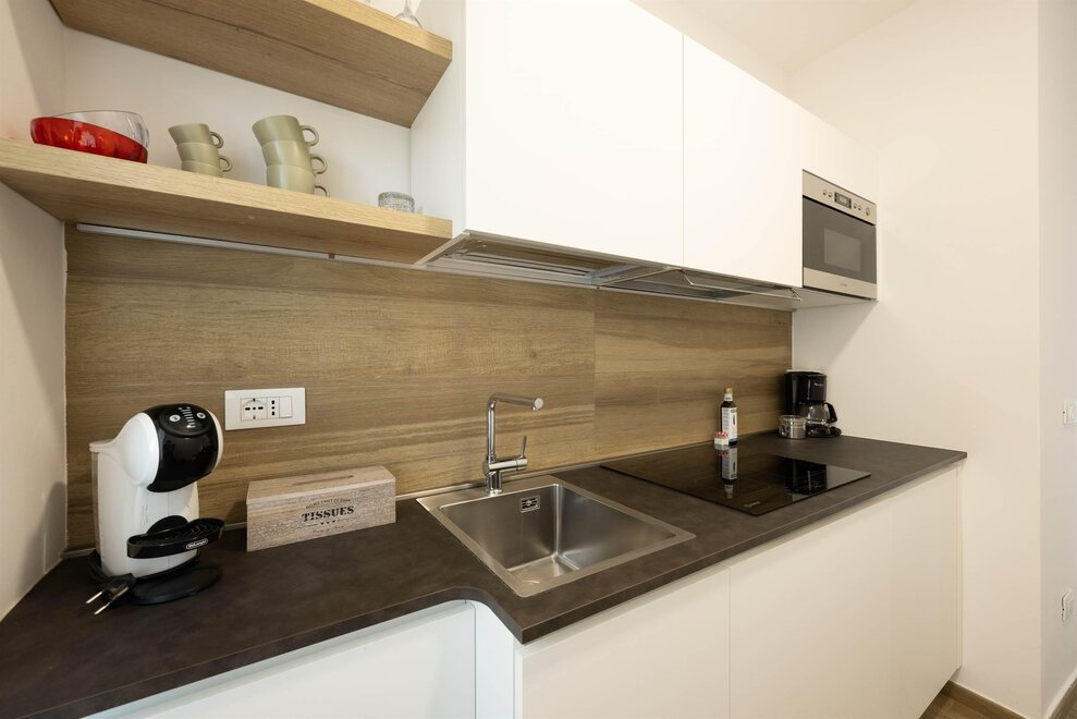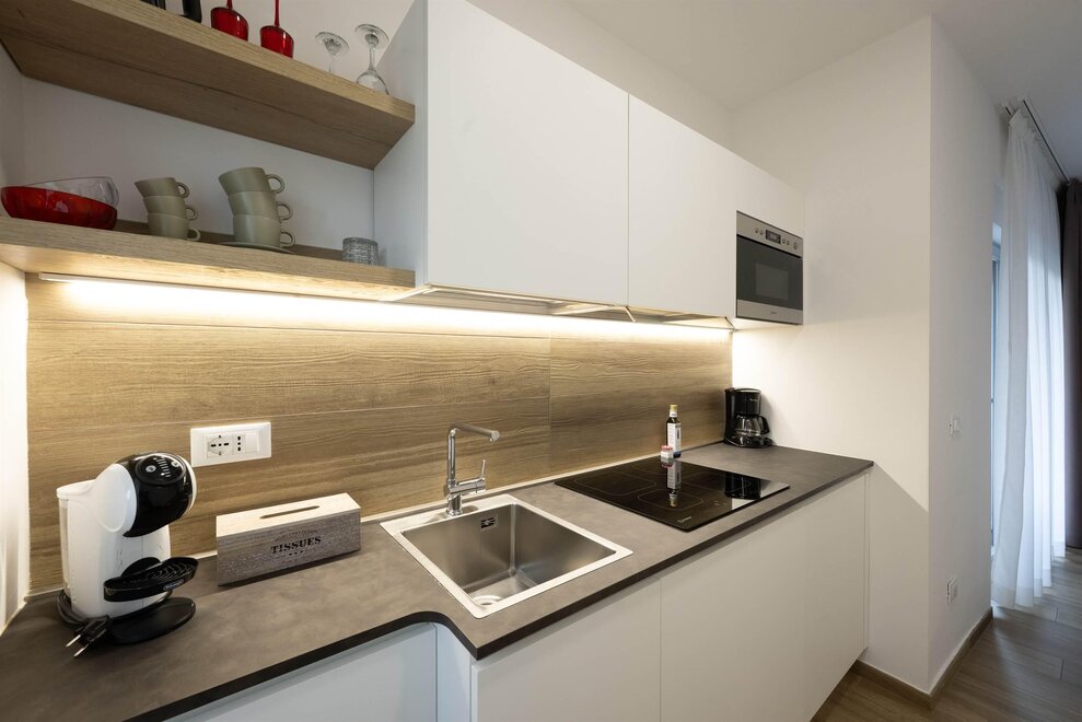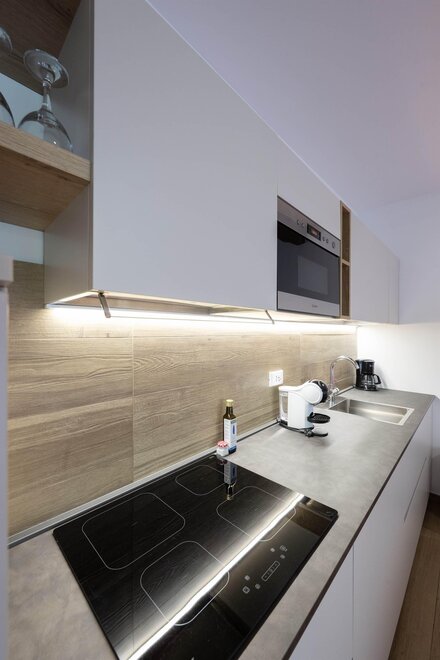 Кухня полностью оснащена: холодильником, индукционной плитой, микроволновой печью, аппаратом для эспрессо / американо.