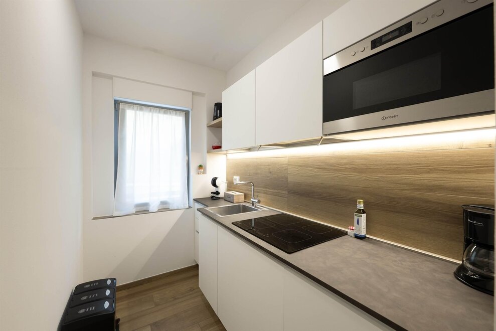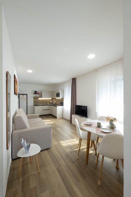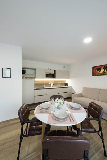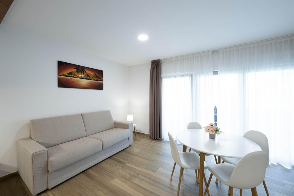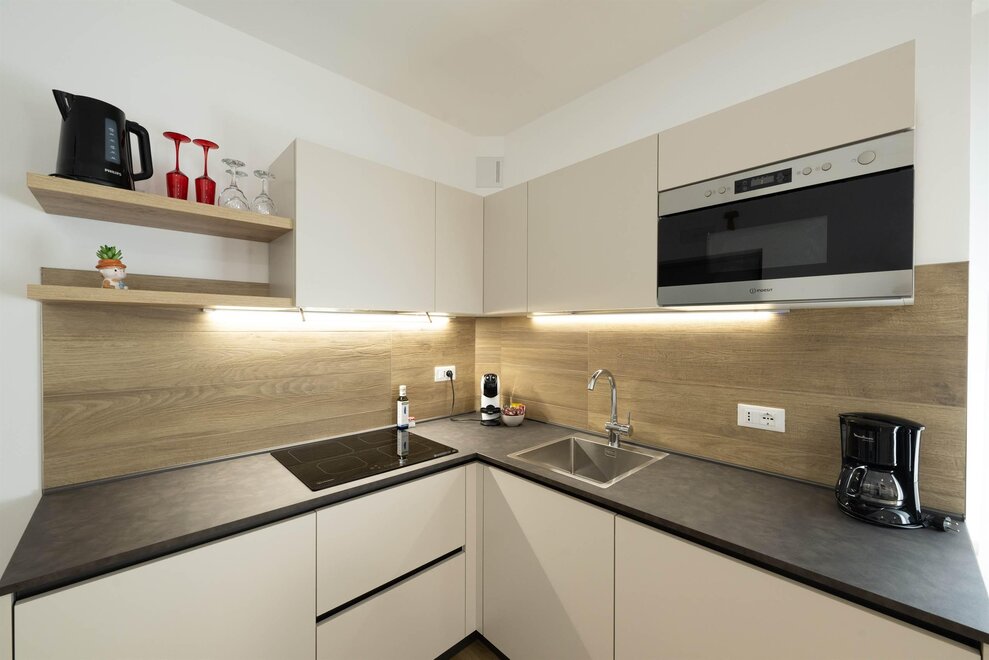 linen provided , apartment without fitted carpet, семейный номер /апт., розетка рядом с кроватью, балкон, кухонная посуда, перины, туалет, прачечная, Wi Fi, кухня, seasonal rental too (summer), ТВ, холодильник, возможность приготовления, отдельная спальня(и): 1, посуда в наличии, чайник, микроволновая печь, постельное белье в наличии, шкаф, совмещенная спальня / гостиная, seasonal rental too (winter), комбинированная микроволновка, мини-косметика в номере, кафельный или мраморный пол, кухонная раковина, обогреватель, crockery and cutlery , электрическая плита, фен, Предметы первой необходимости (Полотенца, простыни, мыло и туалетная бумага), кофеварка, Midweek cleaning only on request - for a fee, полотенца, стиральная машина, современная мебель