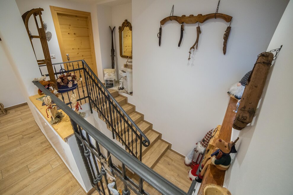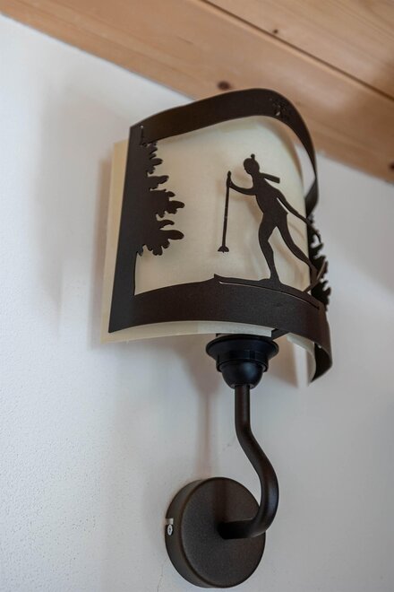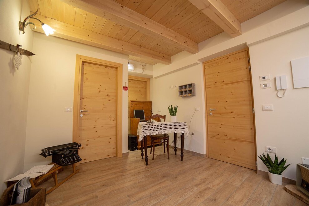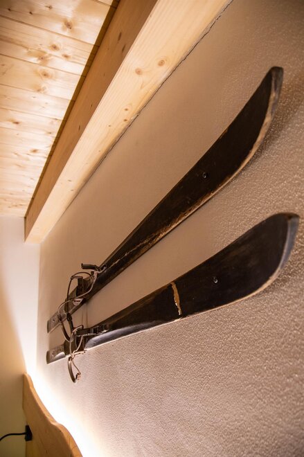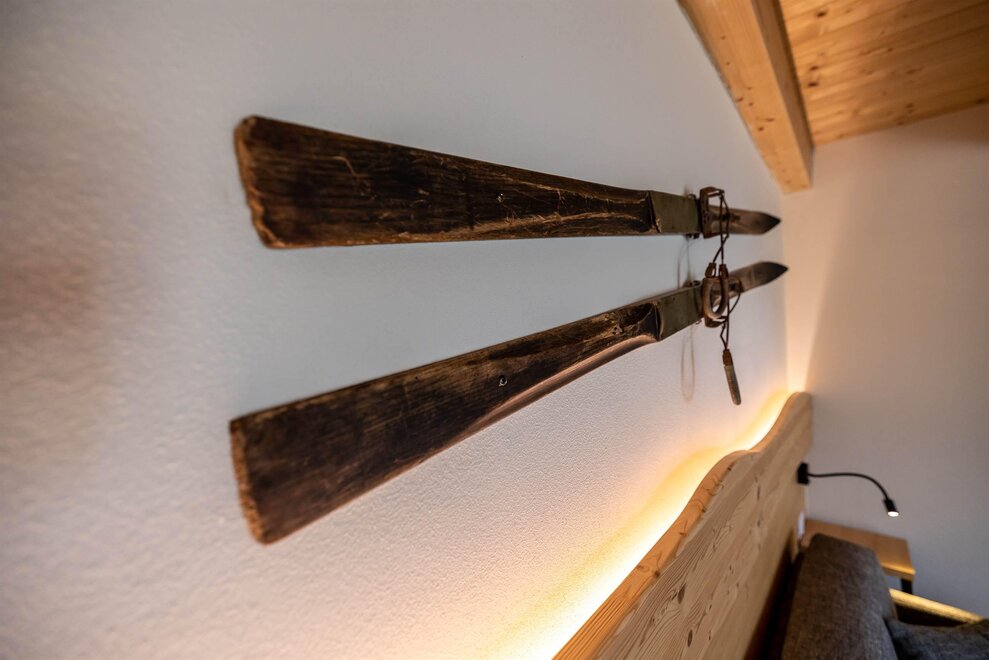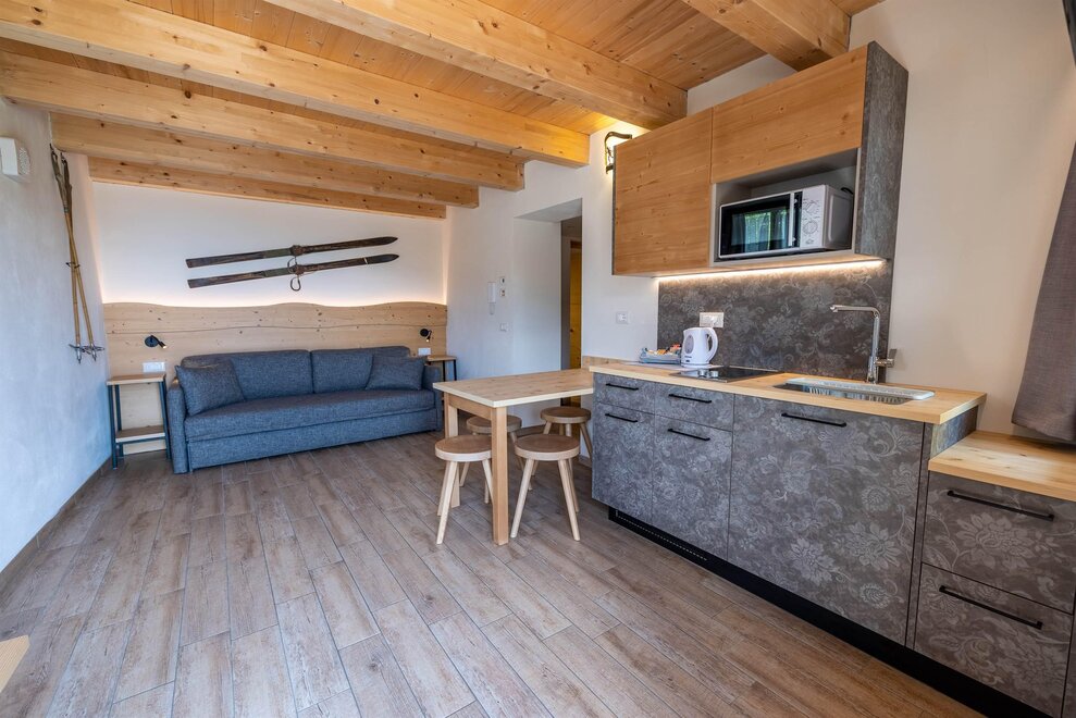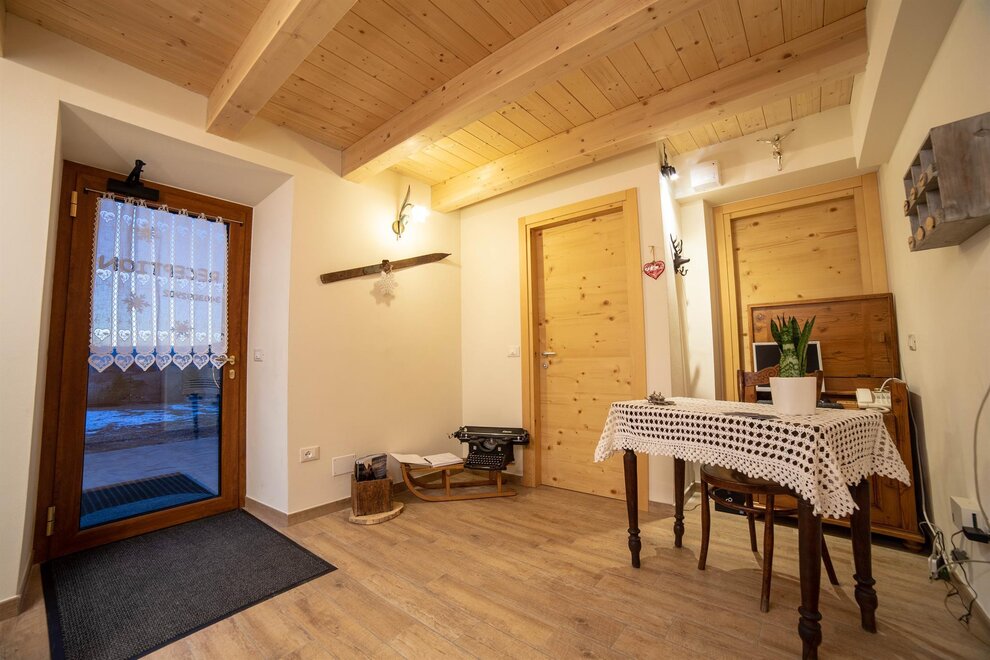 КОМНАТА ДЛЯ ЛЫЖНИКА, характеризующаяся некоторыми аксессуарами, которые повторяют само название, и стилем, который сочетает в себе Rustic и Modern, состоит из зоны отдыха с кухонным уголком и диваном-кроватью, спальни с двуспальной кроватью и двумя ванными комнатами. Вход независим от сада.